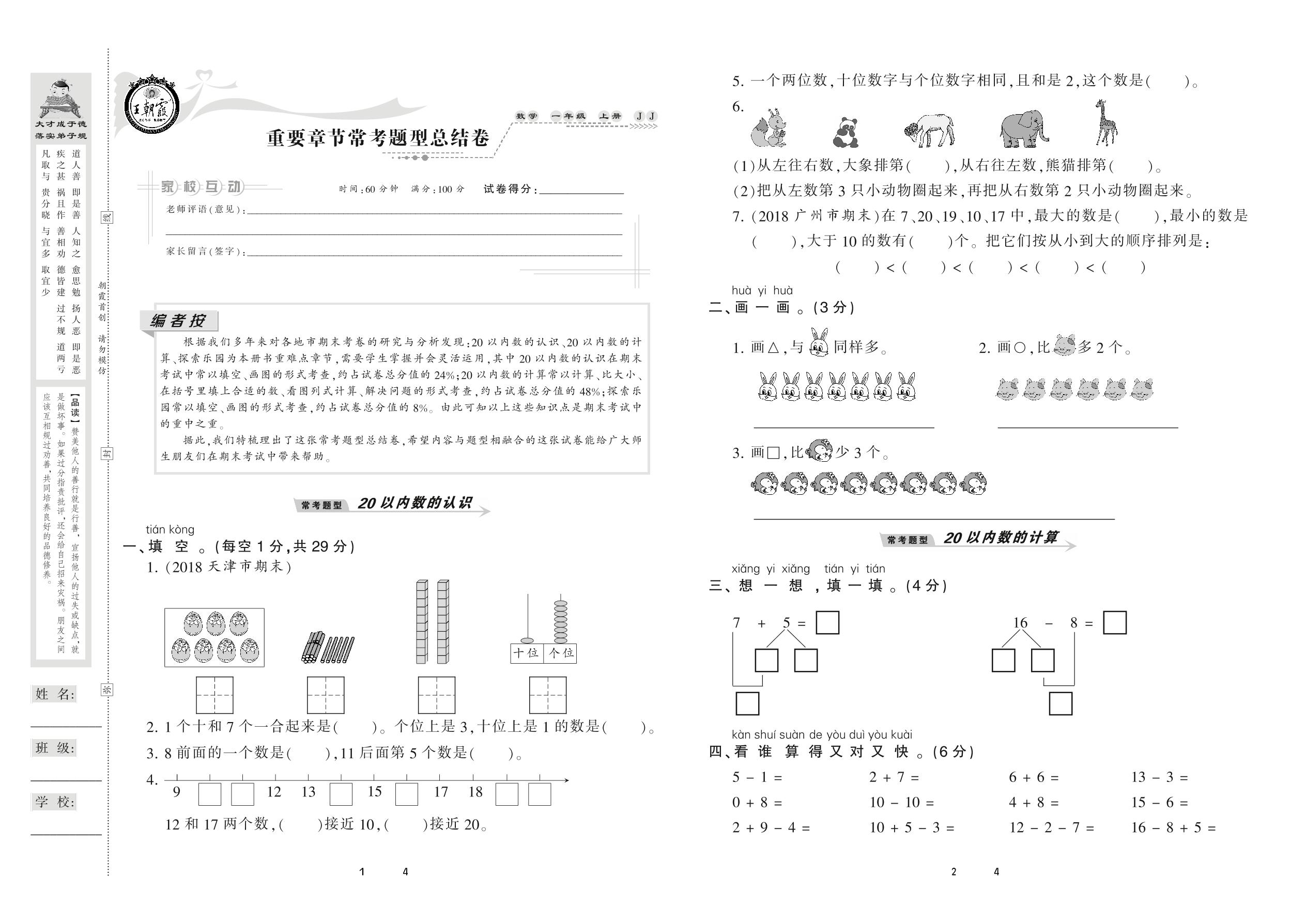2020上册一年级数学冀教版 重要章节常考题型总结卷