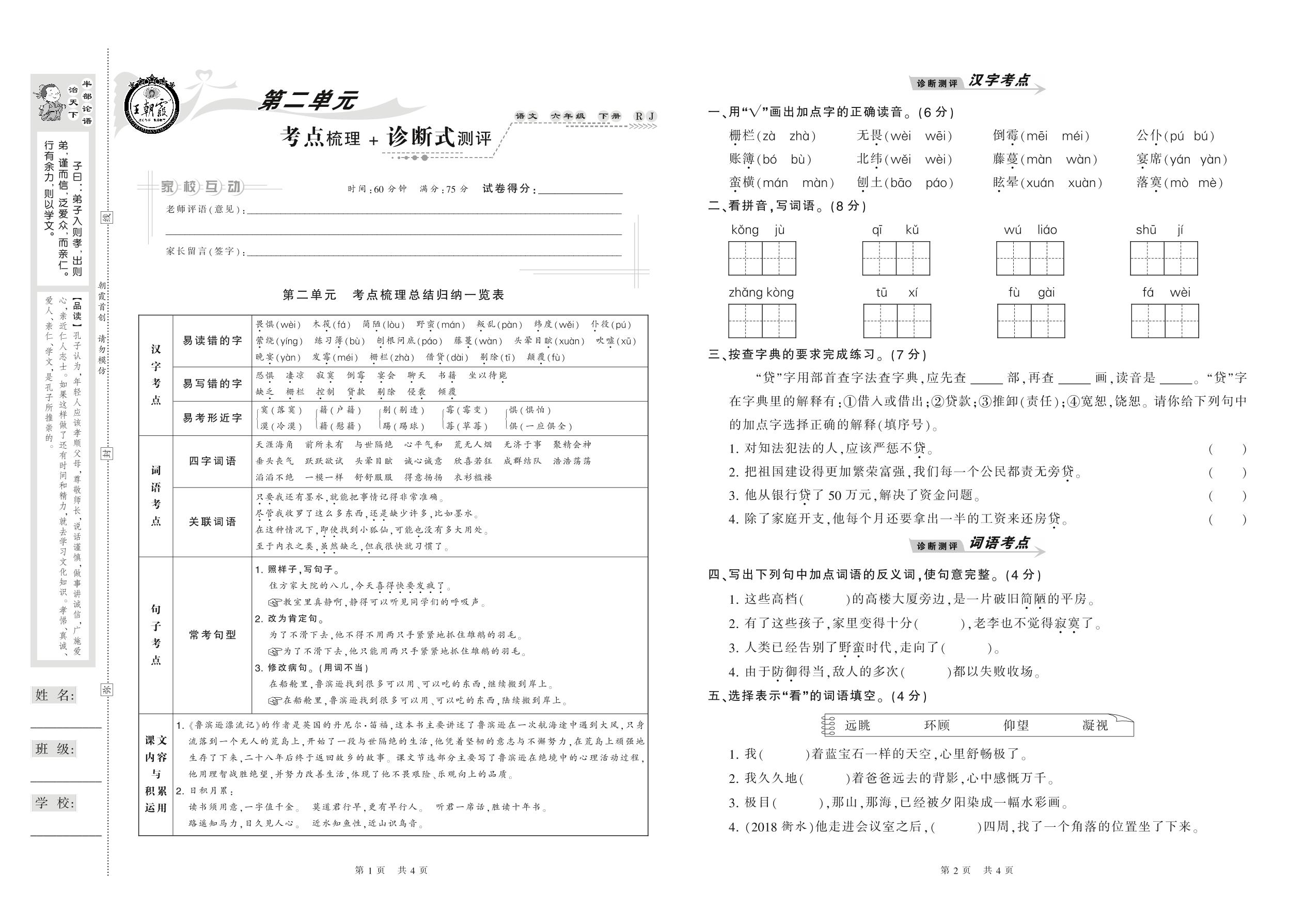 2021下册六年级语文人教版 第二单元 考点梳理+诊断式测评