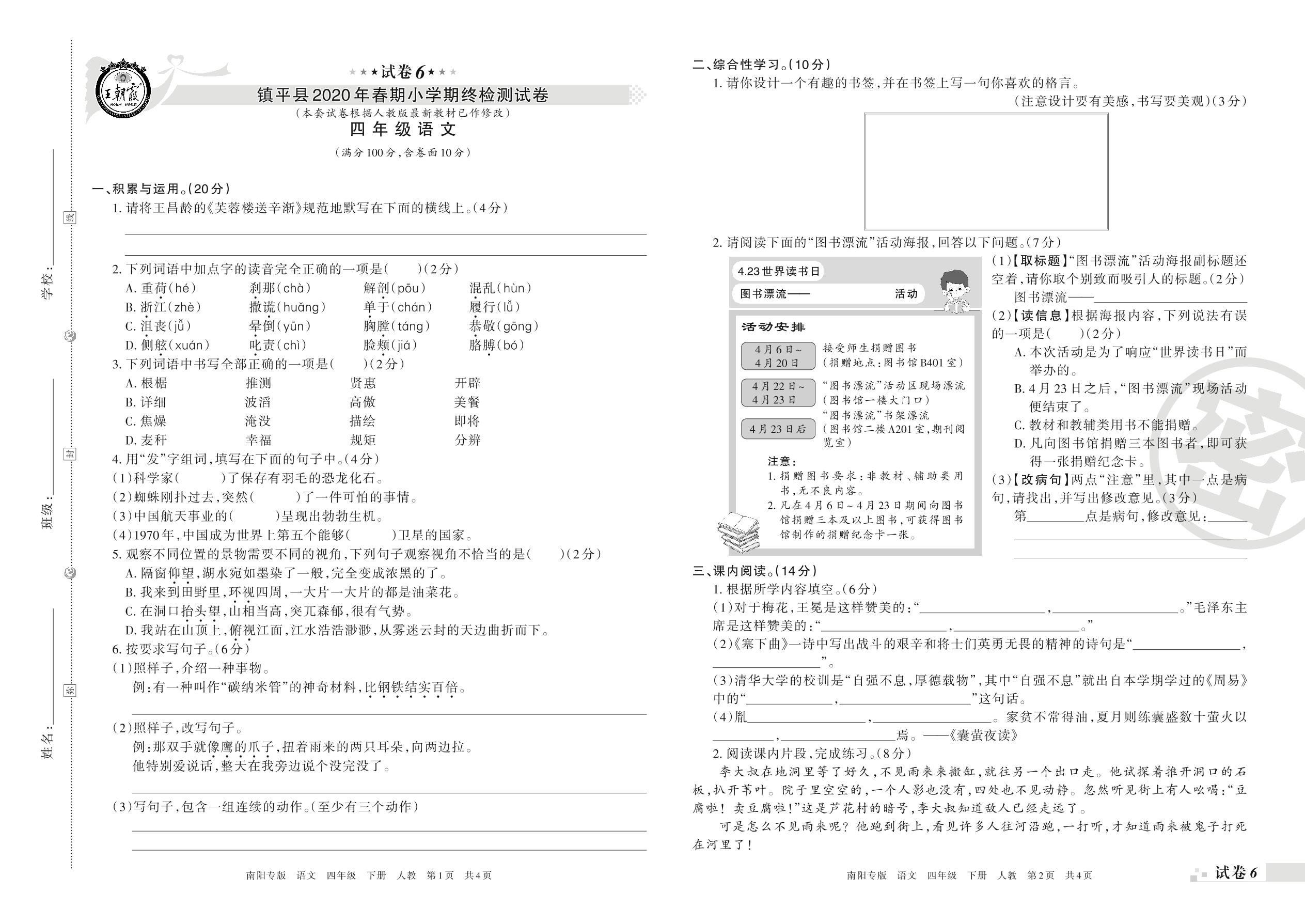 2019-2020学年第二学期南阳市镇平县四年级语文试卷(人教版)【6】