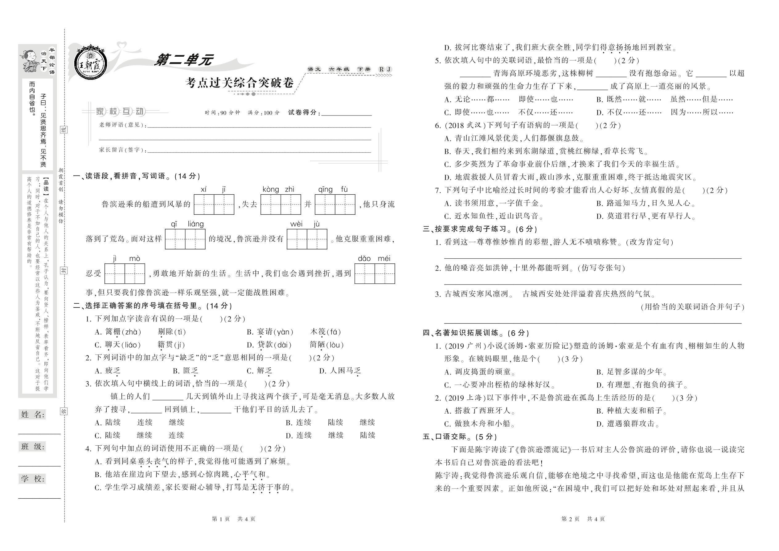 2021下册六年级语文人教版 第二单元 考点过关综合突破卷