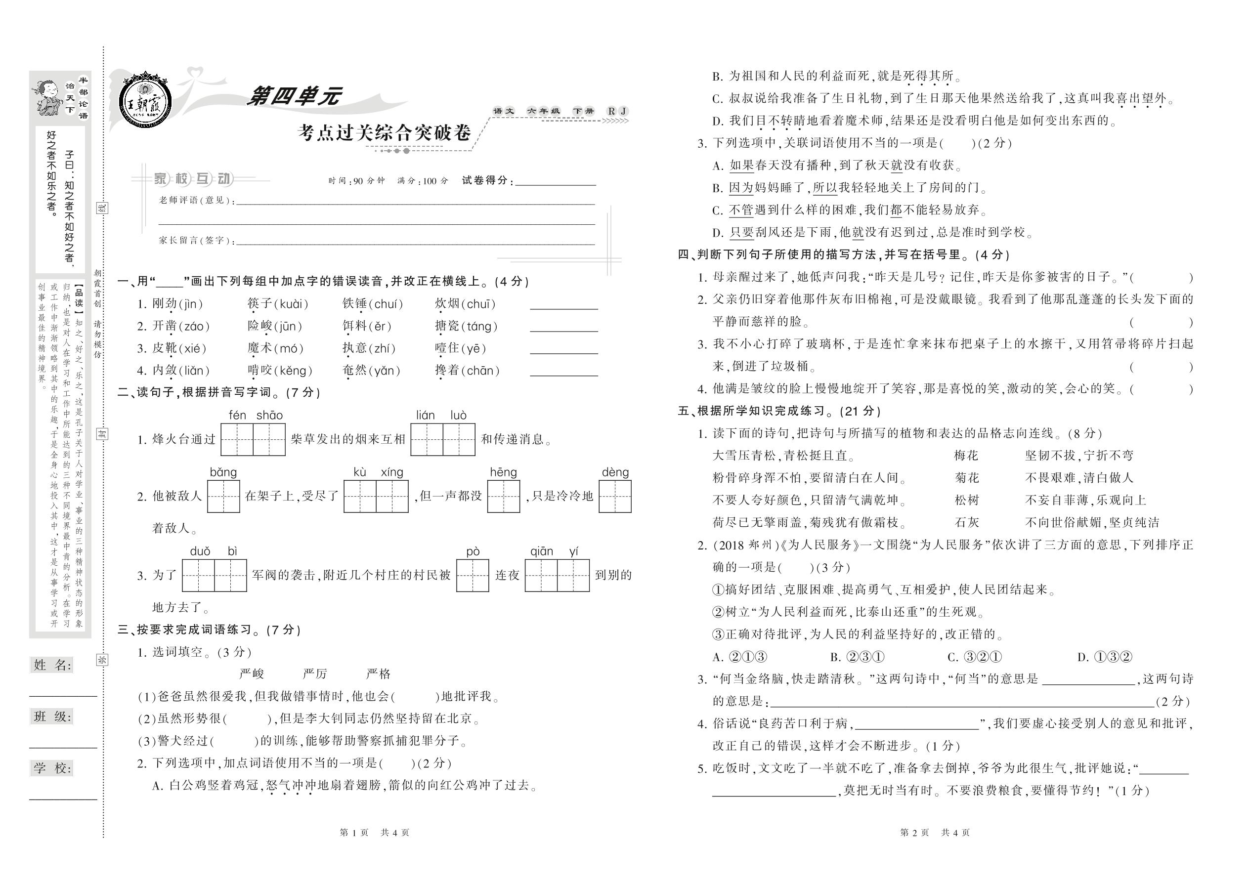 2021下册六年级语文人教版 第四单元 考点过关综合突破卷