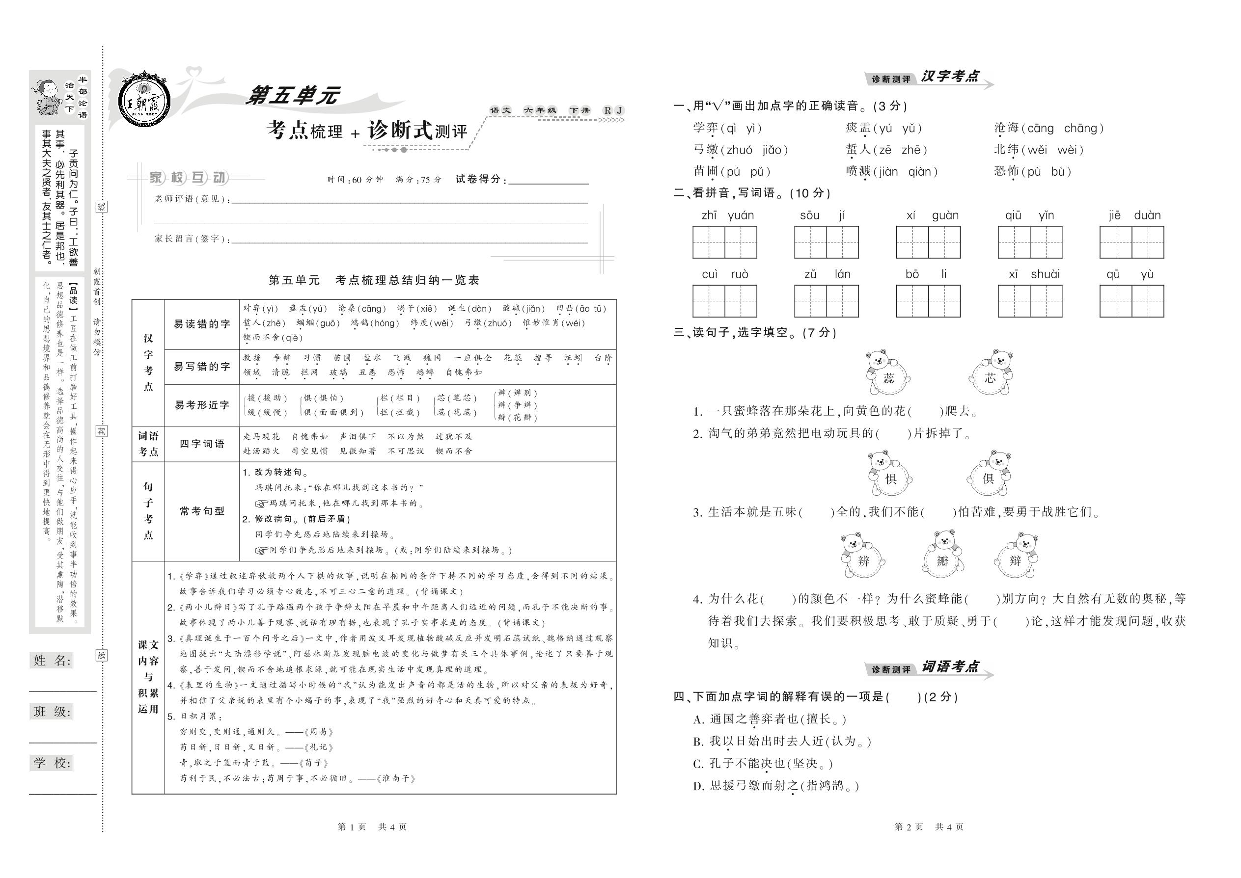 2021下册六年级语文人教版 第五单元 考点梳理+诊断式测评
