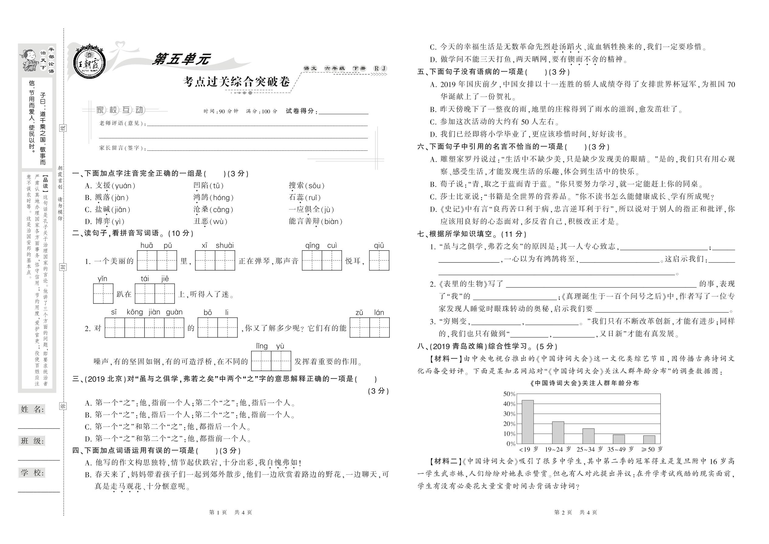 2021下册六年级语文人教版 第五单元 考点过关综合突破卷