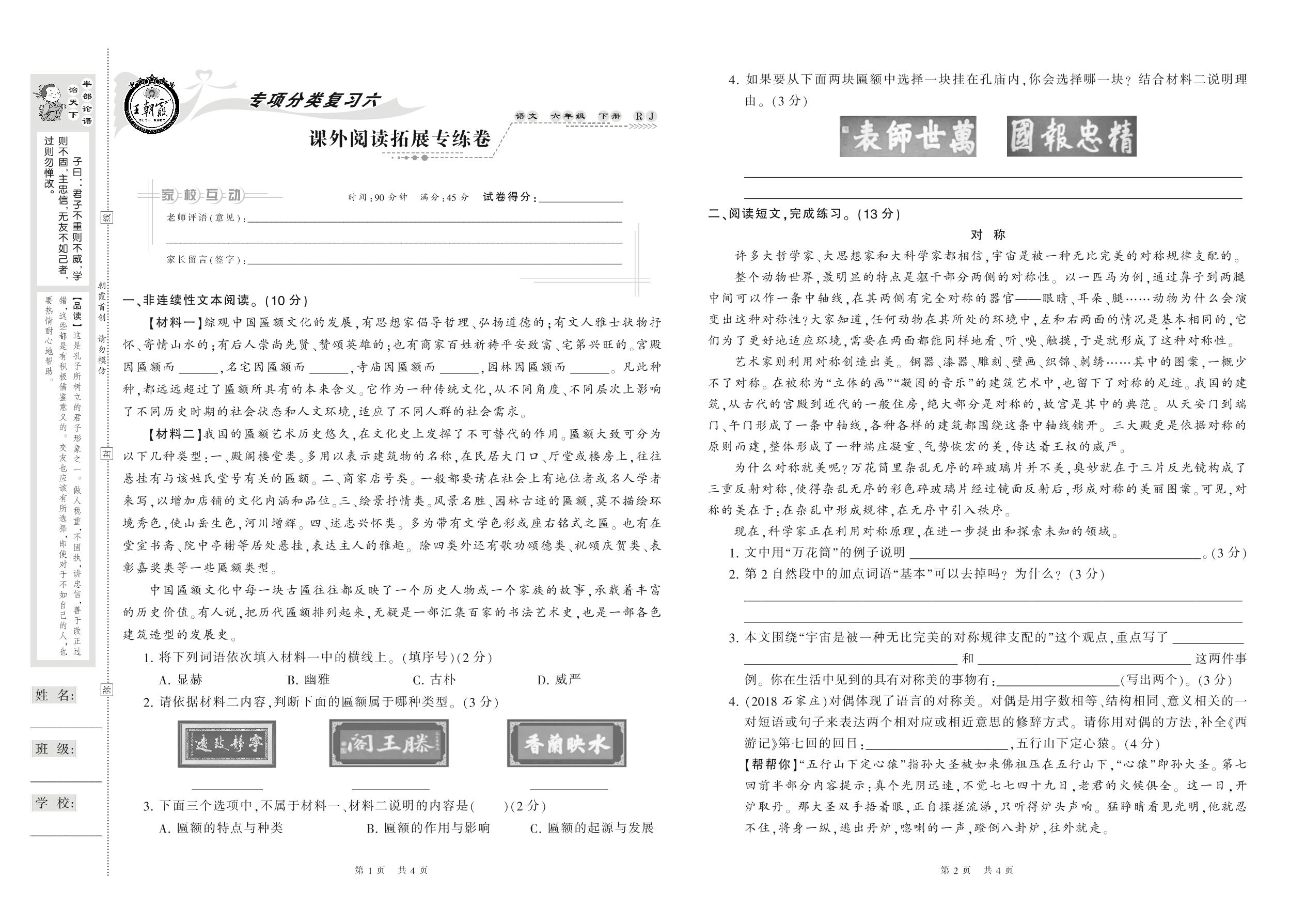 2021下册六年级语文人教版 课外阅读拓展专练卷