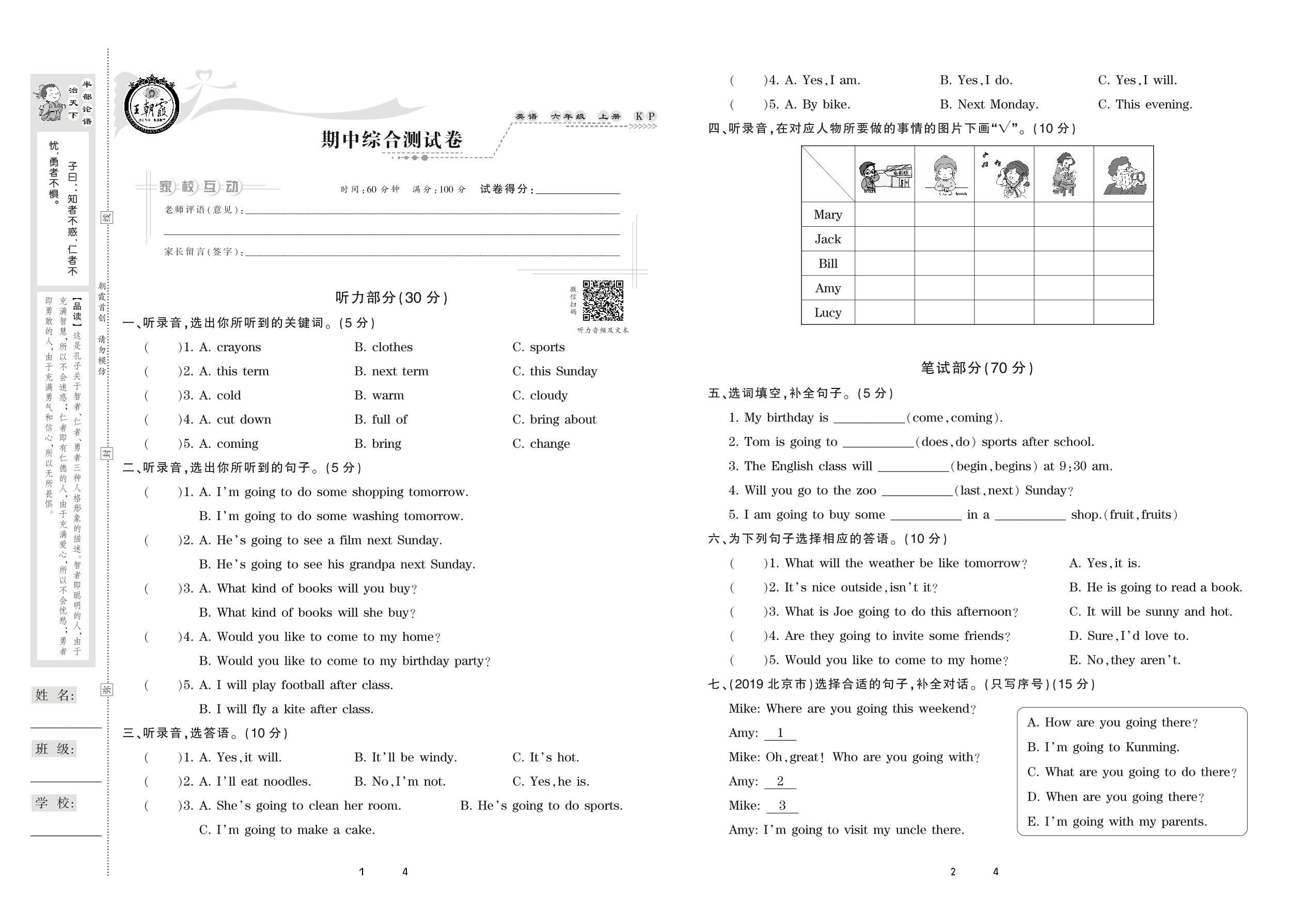 2020上册六年级英语科普版 期中综合测试卷