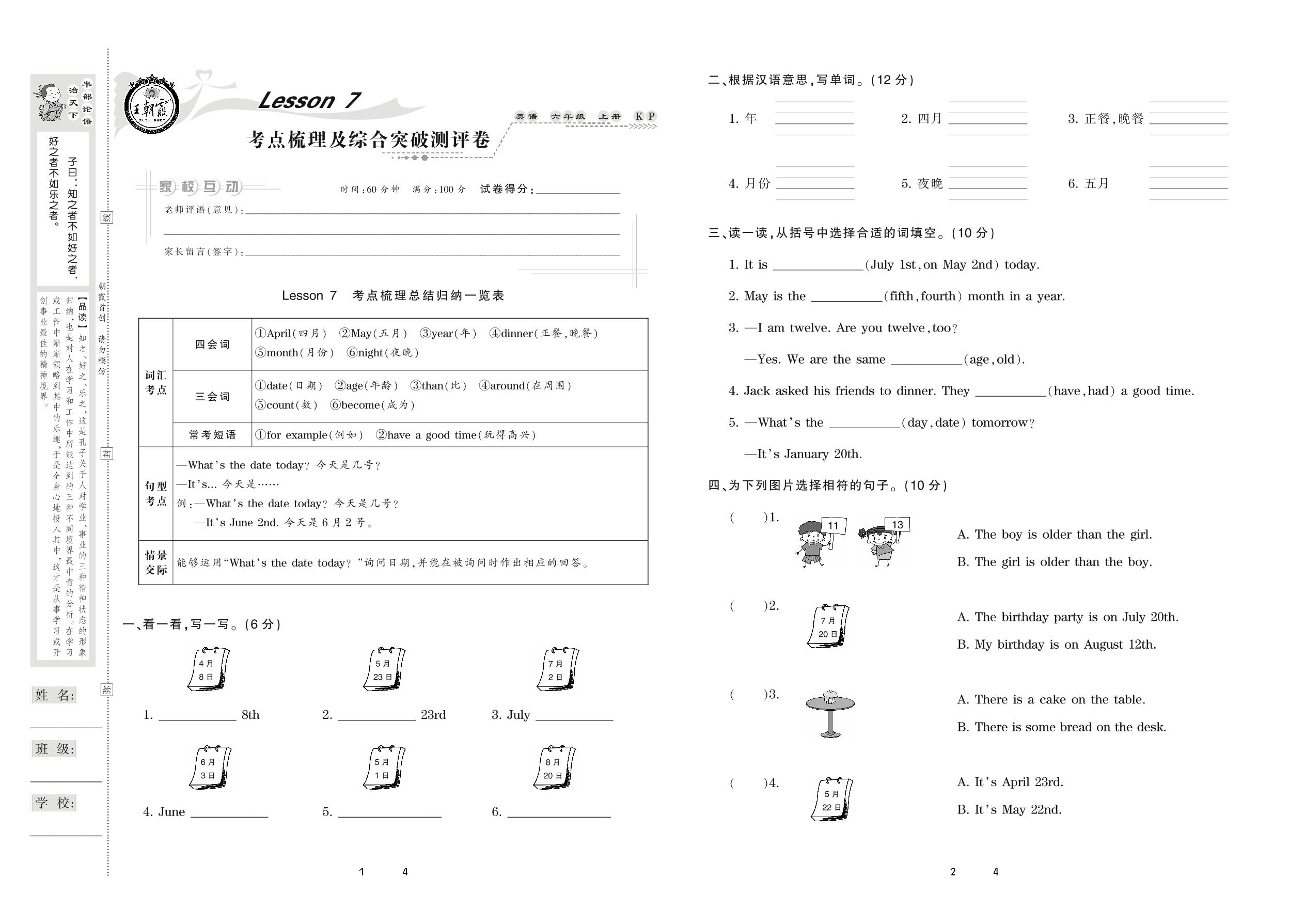 2020上册六年级英语科普版 Lesson 7 考点梳理及综合突破测评卷