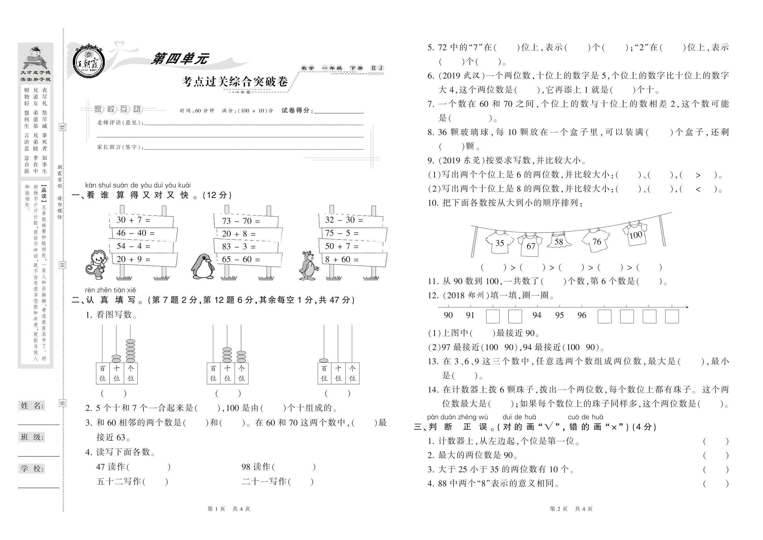 2021下册一年级数学人教版 第四单元 考点过关综合突破卷_R210924152555014