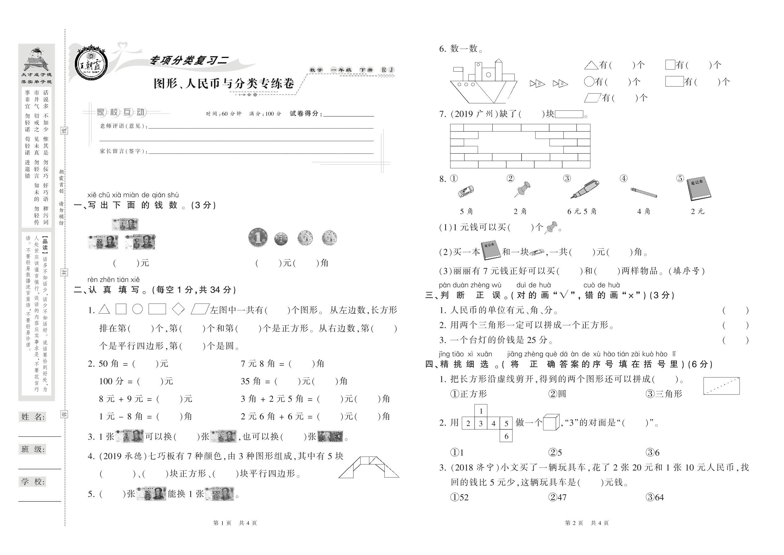 2021下册一年级数学人教版 图形、人民币与分类专练卷
