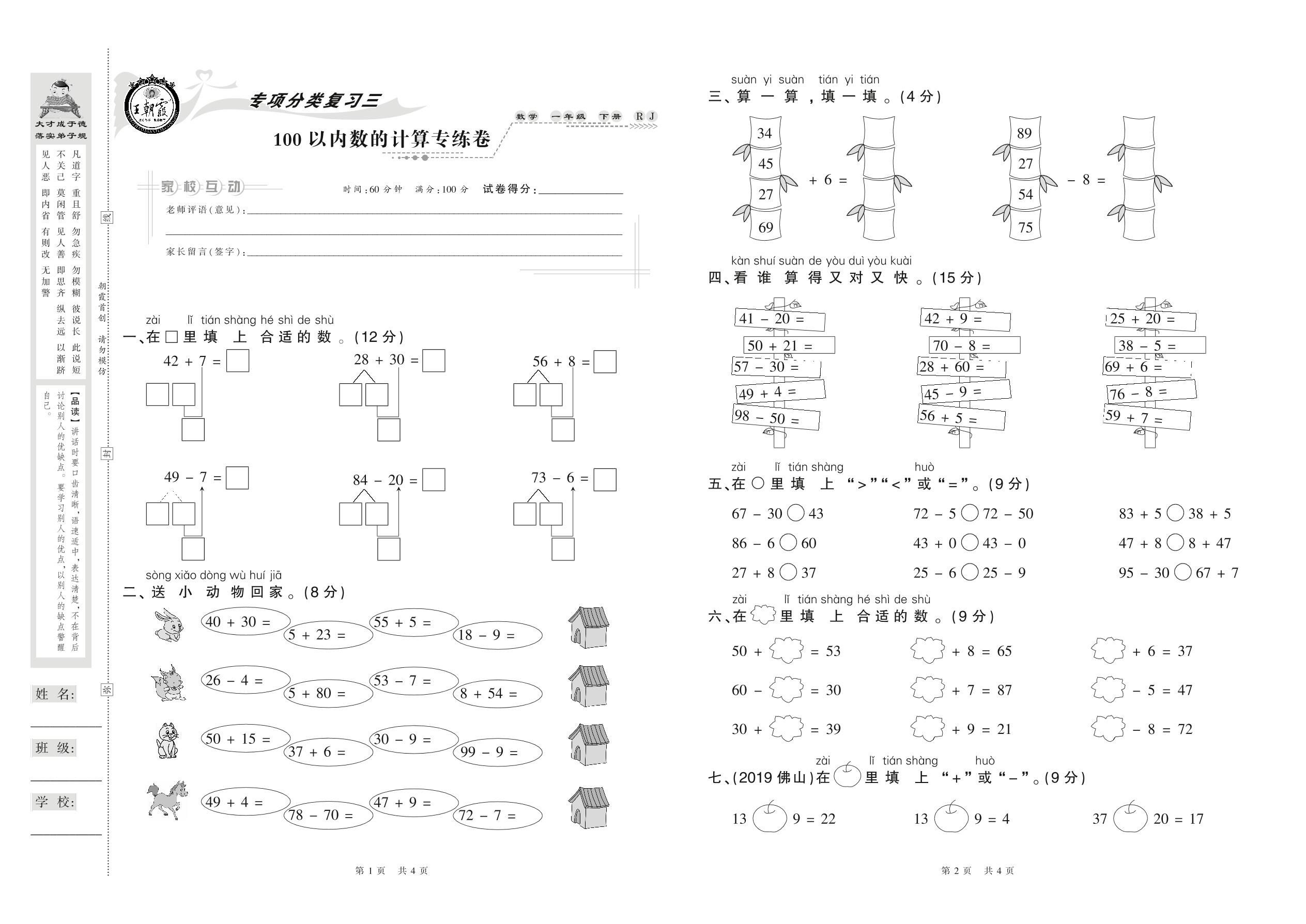 2021下册一年级数学人教版 100以内数的计算专练卷