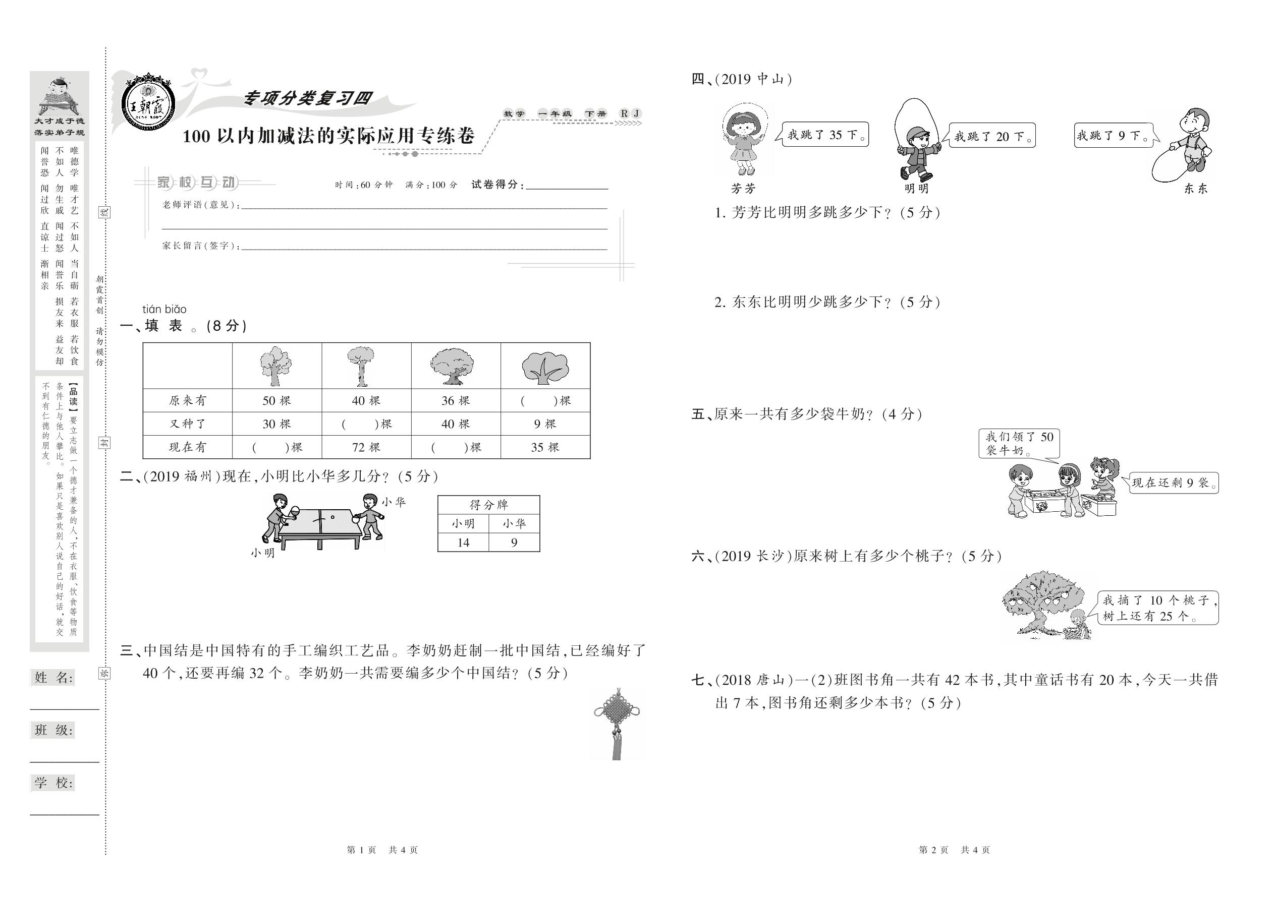 2021下册一年级数学人教版 100以内加减法的实际应用专练卷