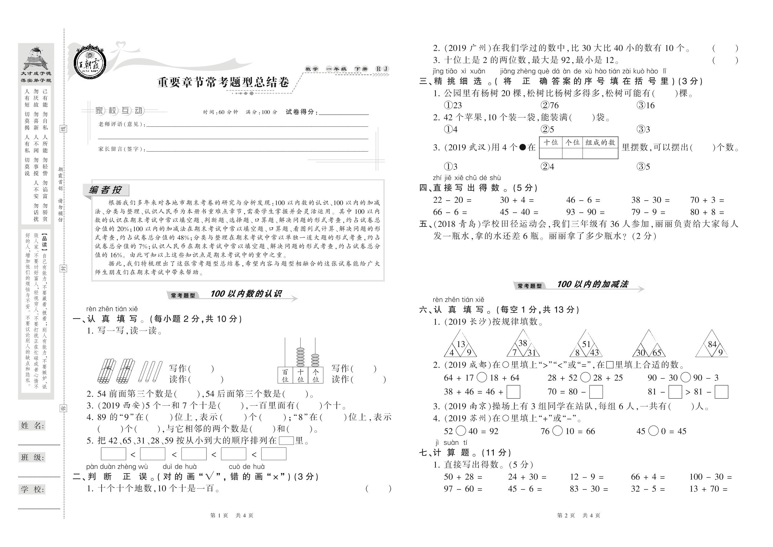 2021下册一年级数学人教版 重要章节常考题型总结卷