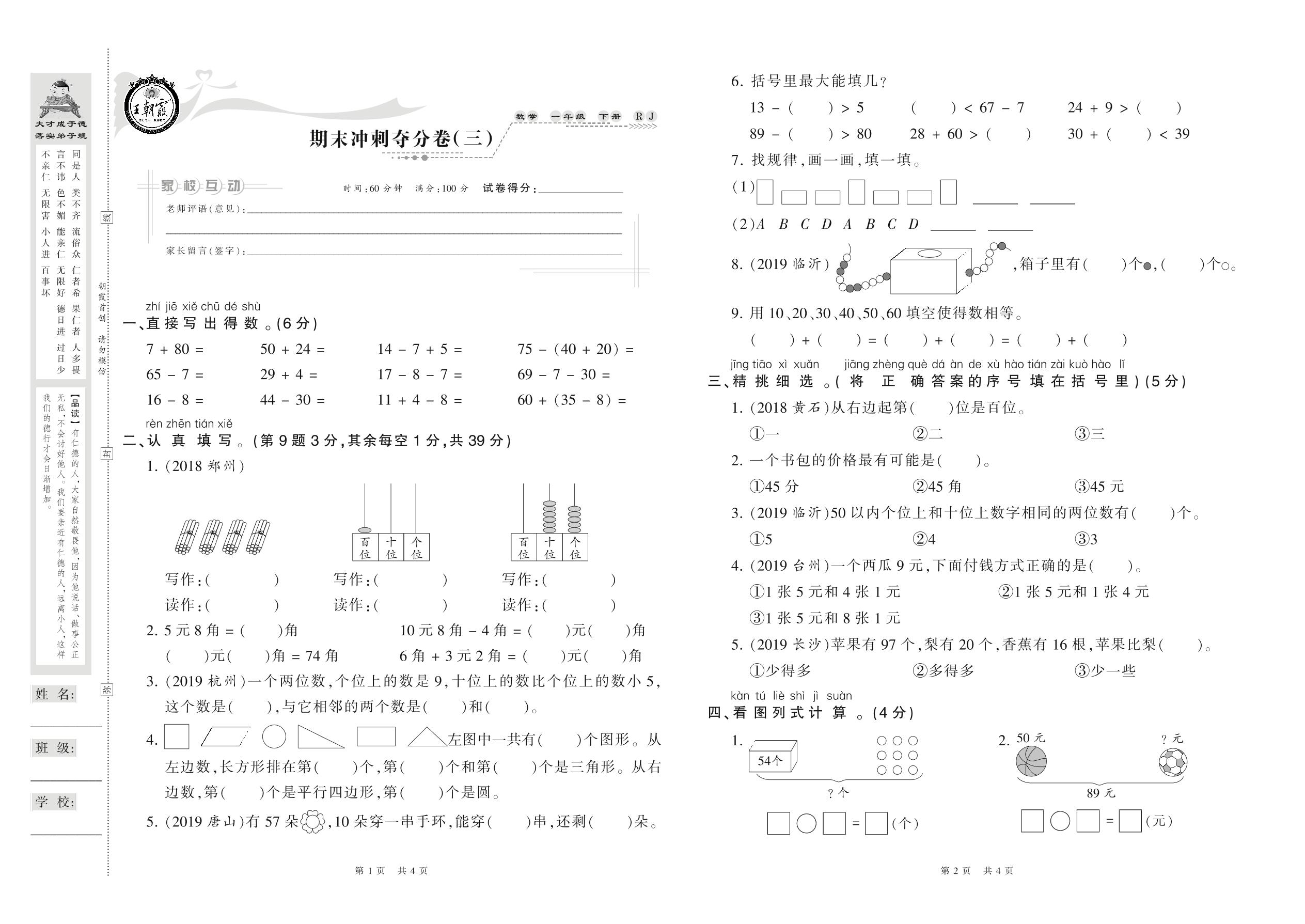 2021下册一年级数学人教版 期末冲刺夺分卷(三)