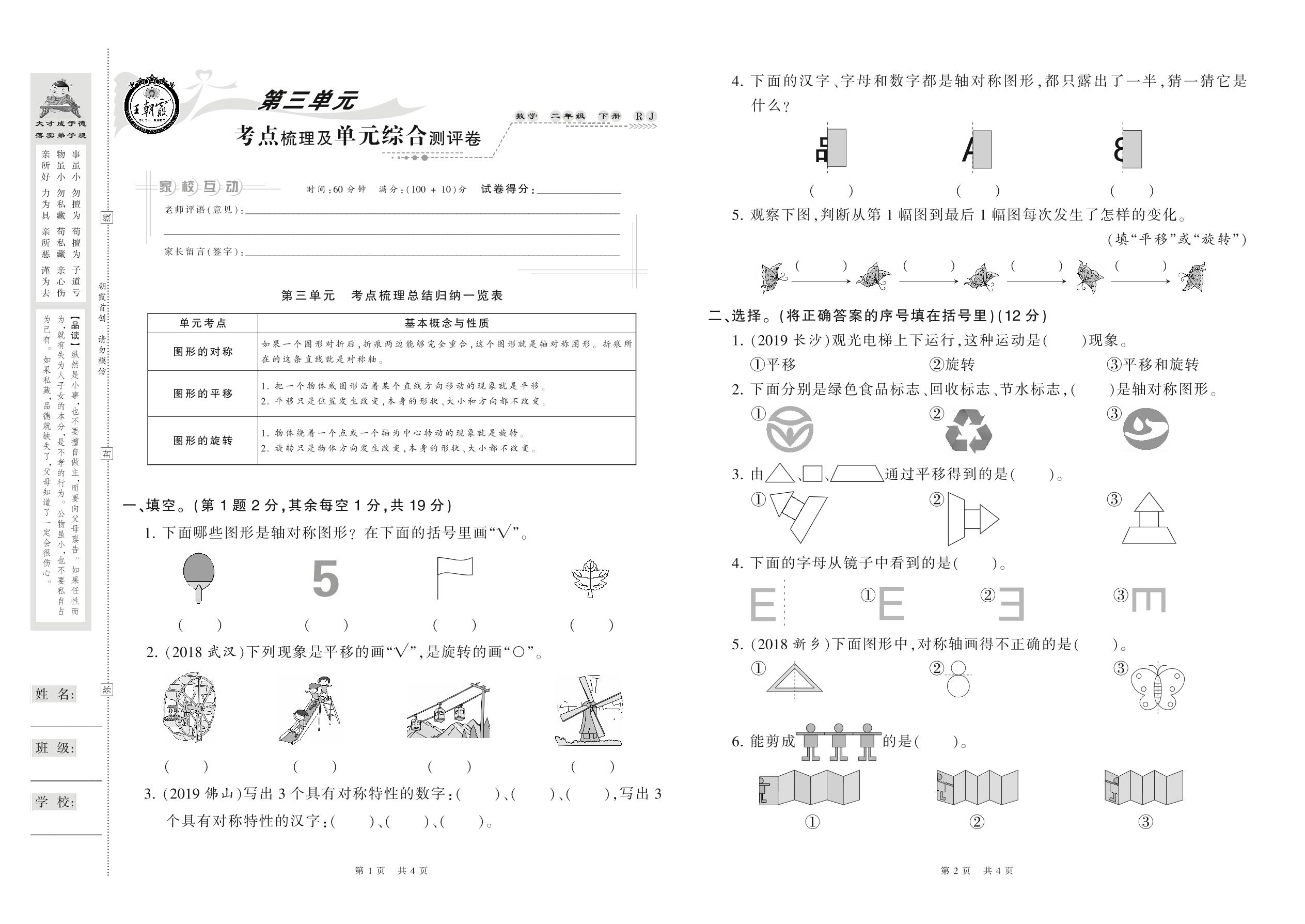 2021下册二年级数学人教版 第三单元 考点梳理及单元综合测评卷