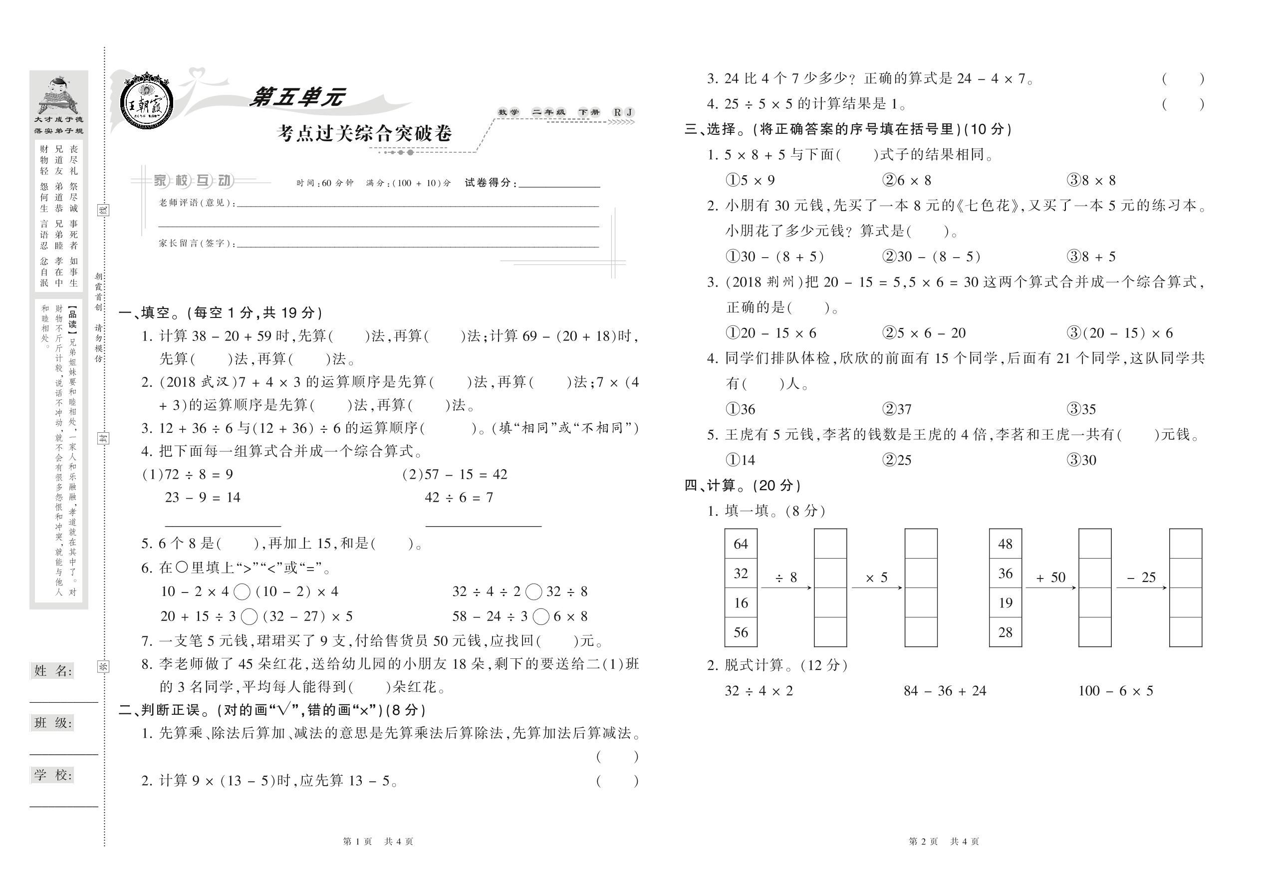 2021下册二年级数学人教版 第五单元 考点过关综合突破卷
