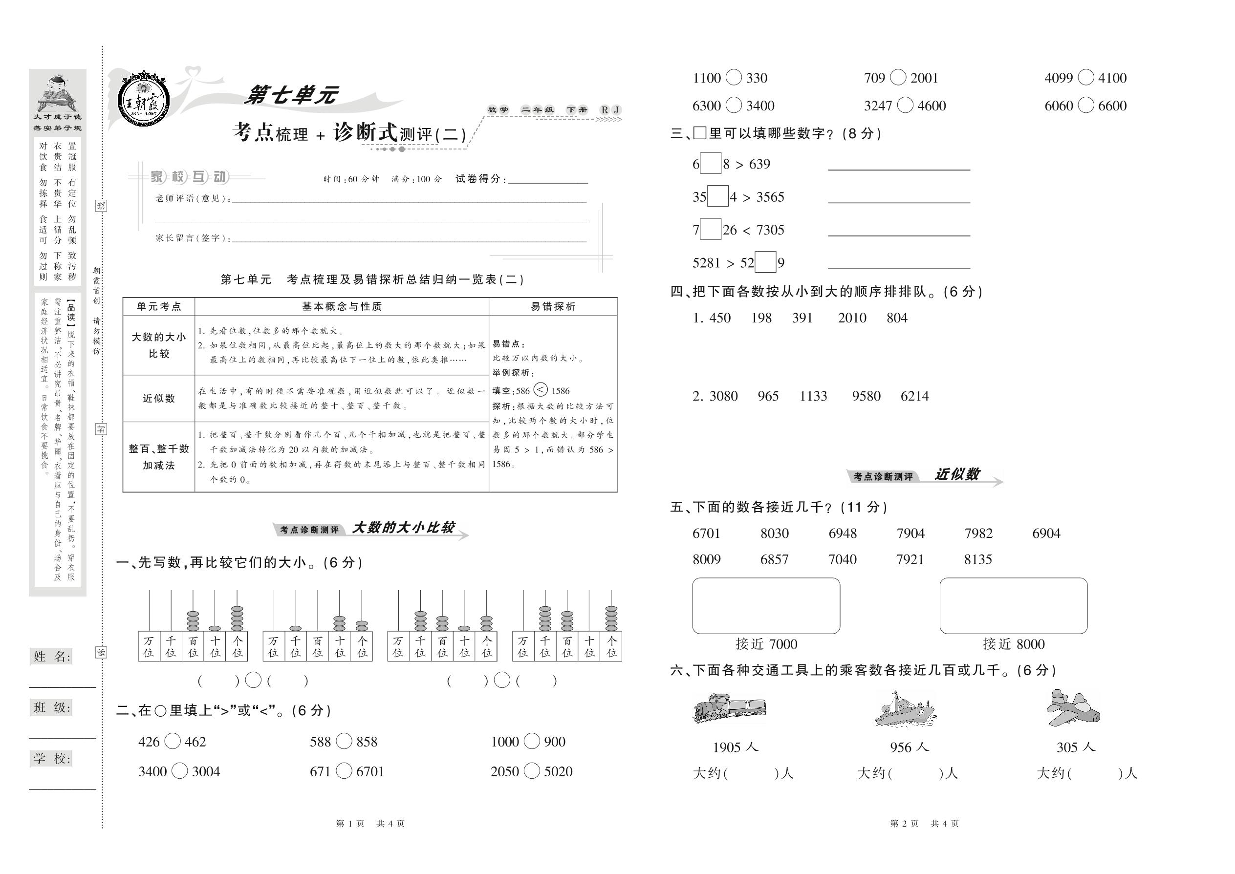 2021下册二年级数学人教版 第七单元 考点梳理+诊断式测评(二)