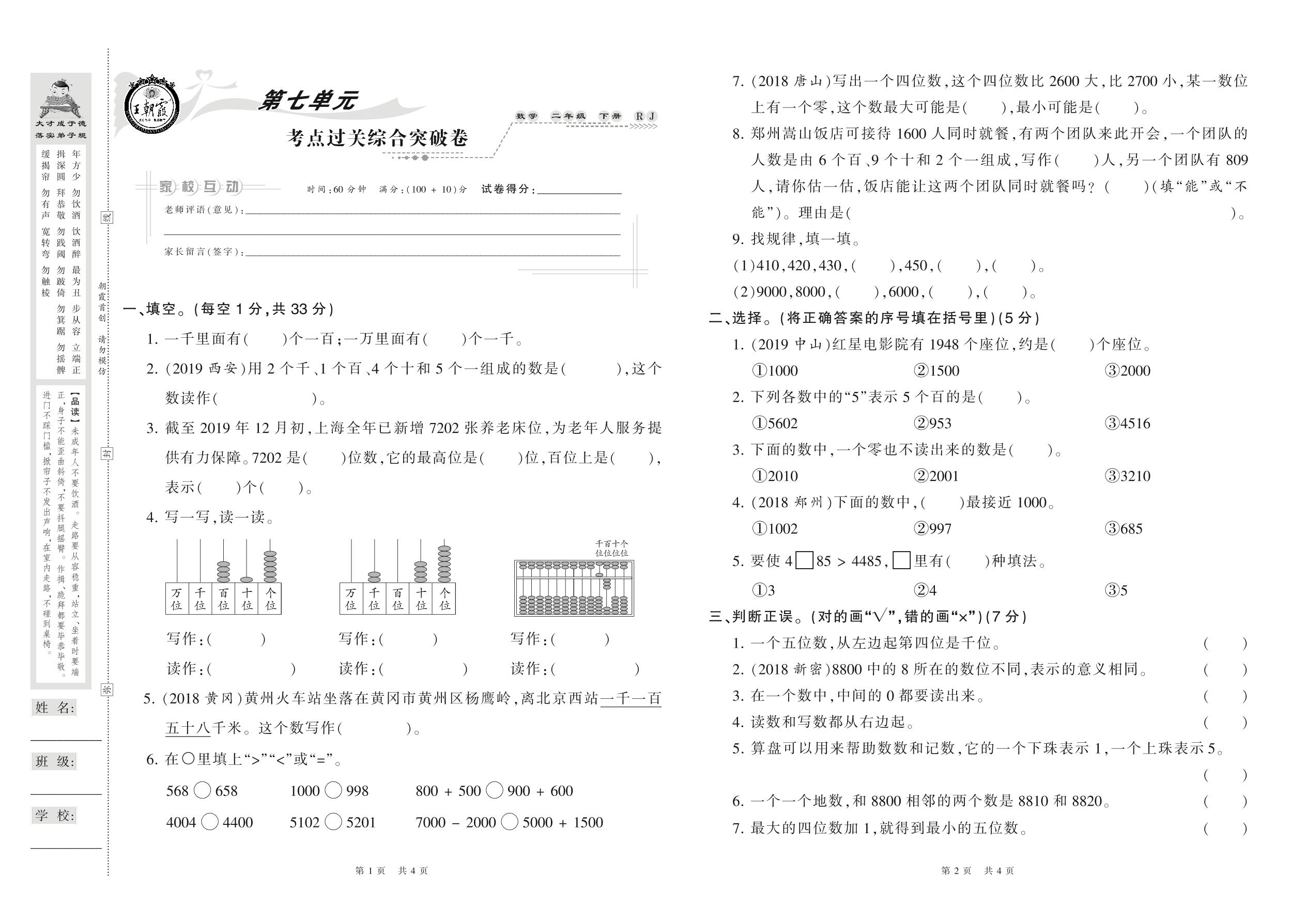 2021下册二年级数学人教版 第七单元 考点过关综合突破卷