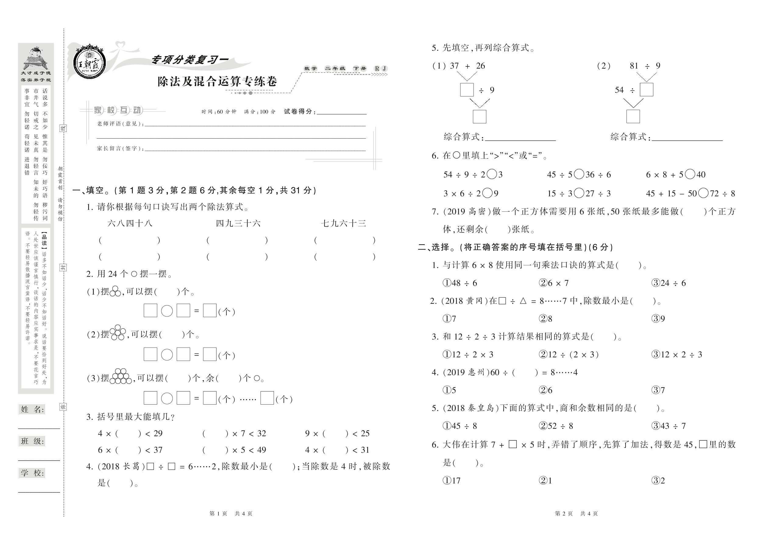 2021下册二年级数学人教版 除法及混合运算专练卷