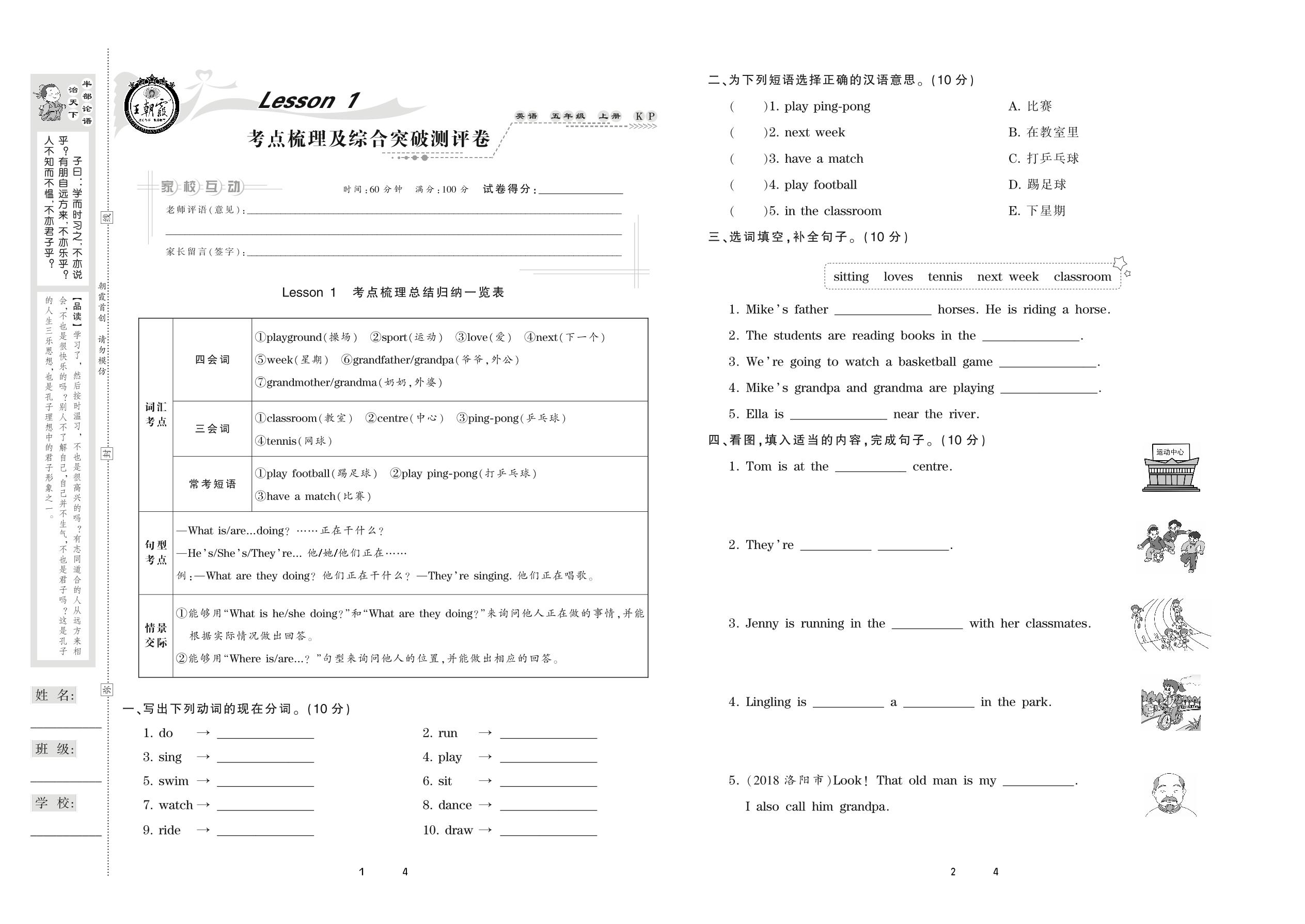 2020上册五年级英语科普版 Lesson 1 考点梳理及综合突破测评卷
