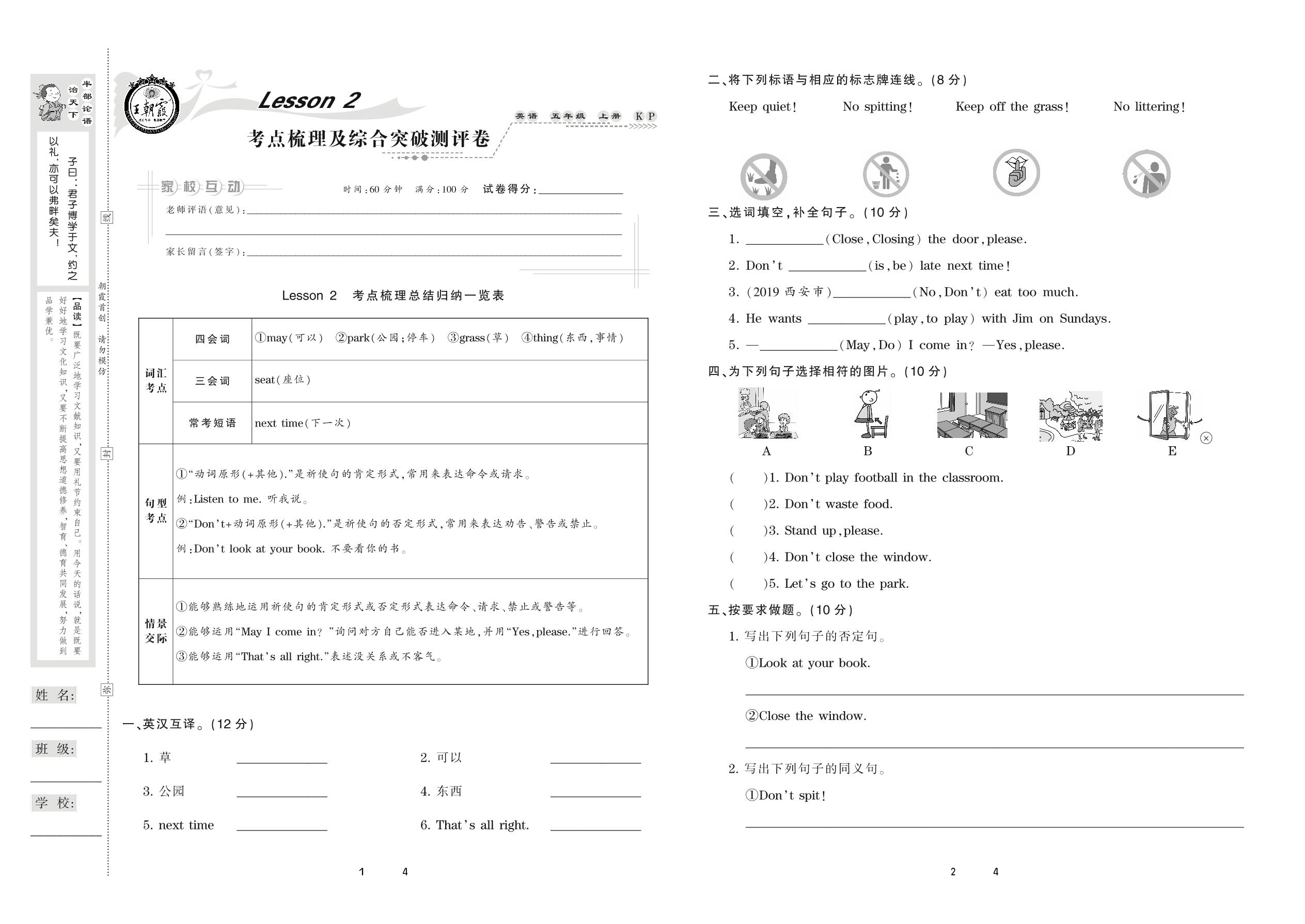 2020上册五年级英语科普版 Lesson 2 考点梳理及综合突破测评卷
