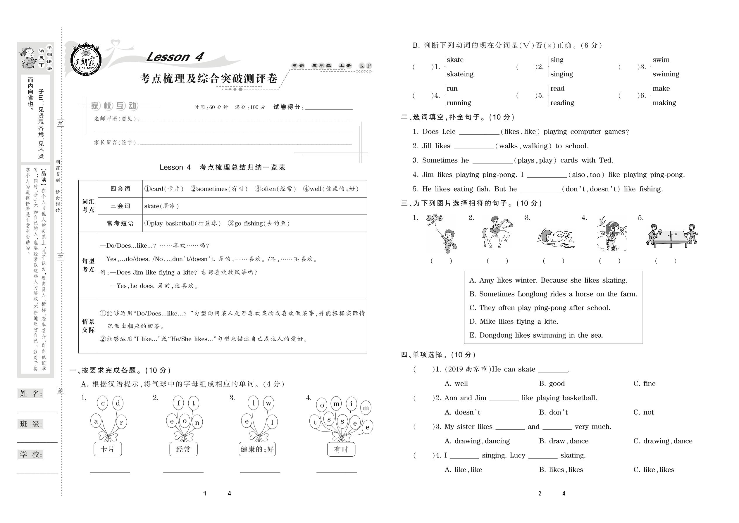 2020上册五年级英语科普版 Lesson 4 考点梳理及综合突破测评卷