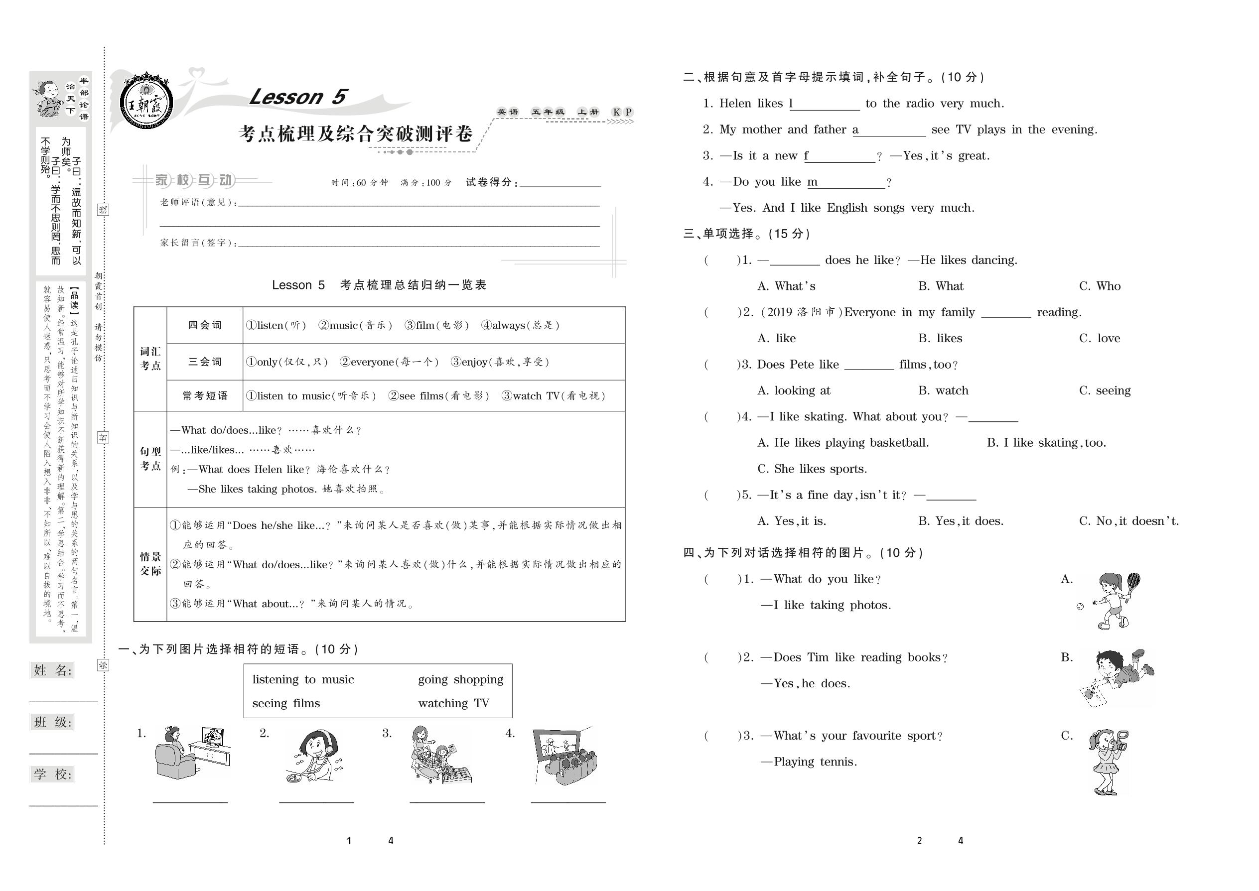 2020上册五年级英语科普版 Lesson 5 考点梳理及综合突破测评卷