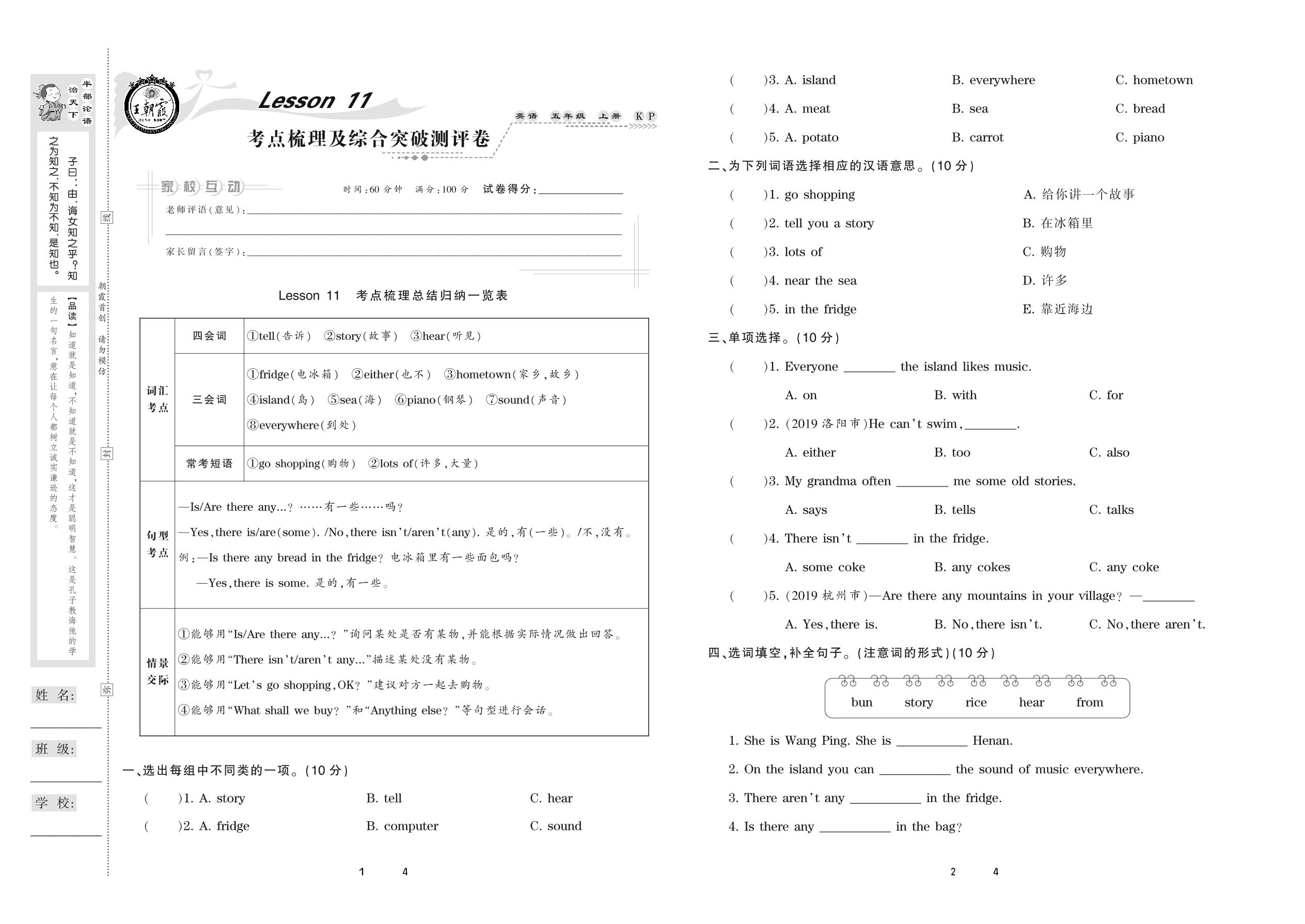 2020上册五年级英语科普版 Lesson 11 考点梳理及综合突破测评卷