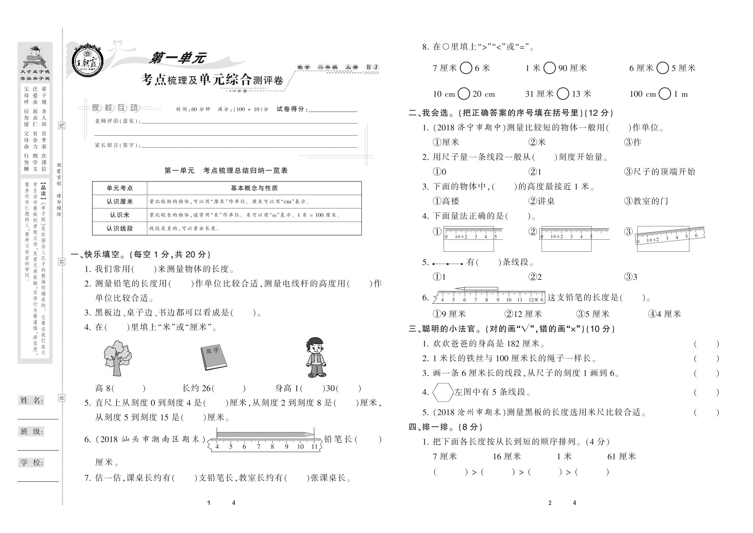 2020上册二年级数学人教版 第一单元 考点梳理及单元综合测评卷