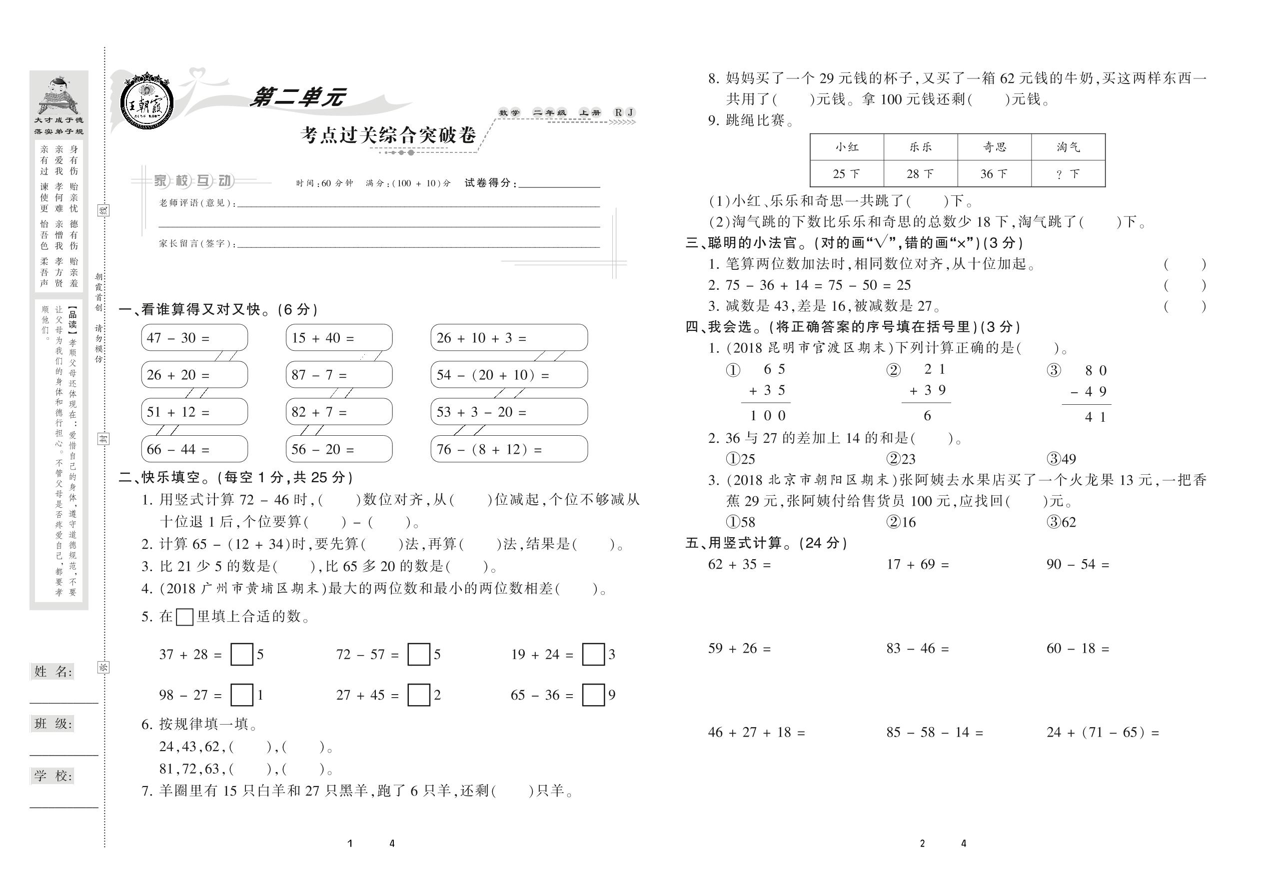2020上册二年级数学人教版 第二单元 考点过关综合突破卷