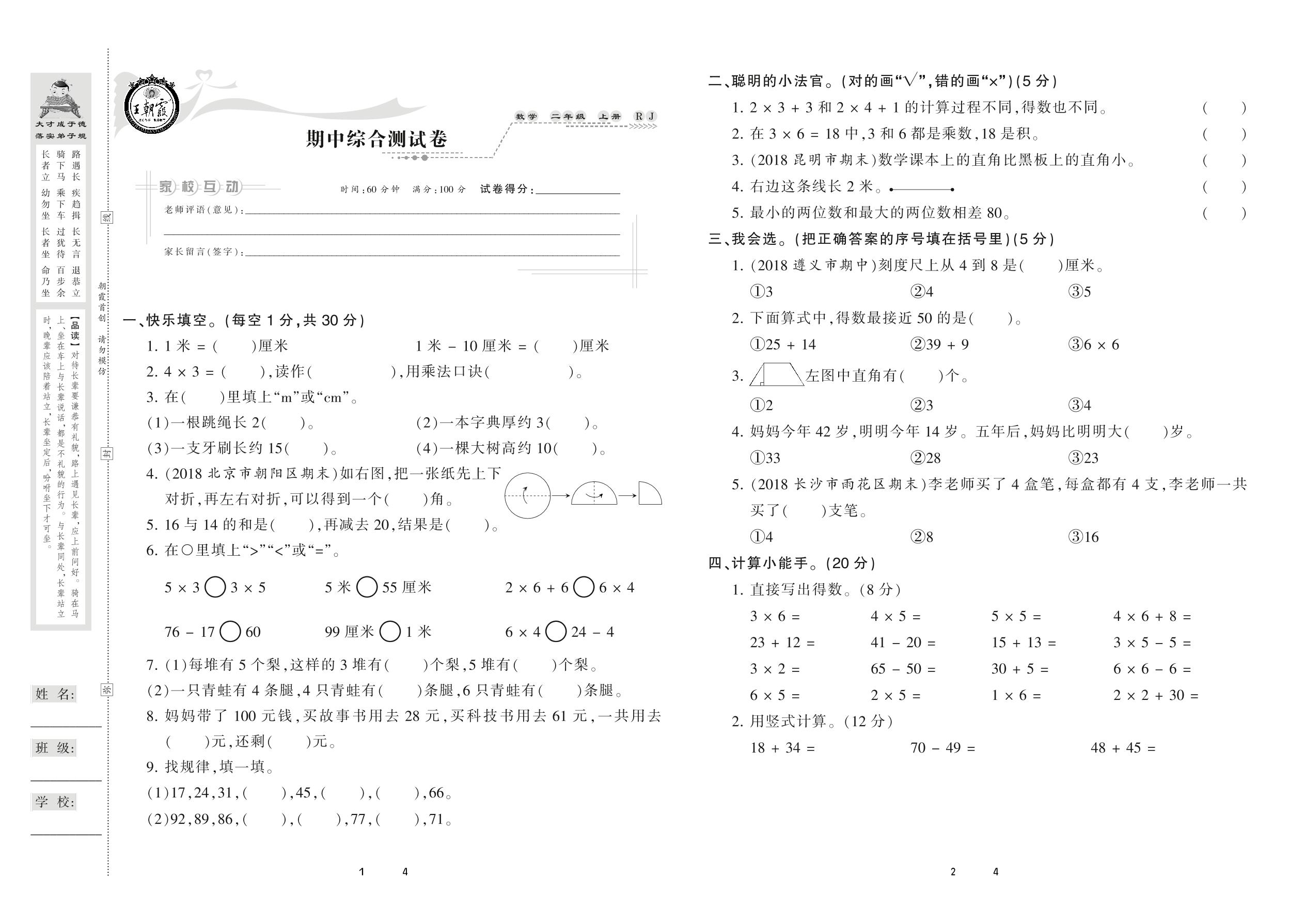2020上册二年级数学人教版 期中综合测试卷