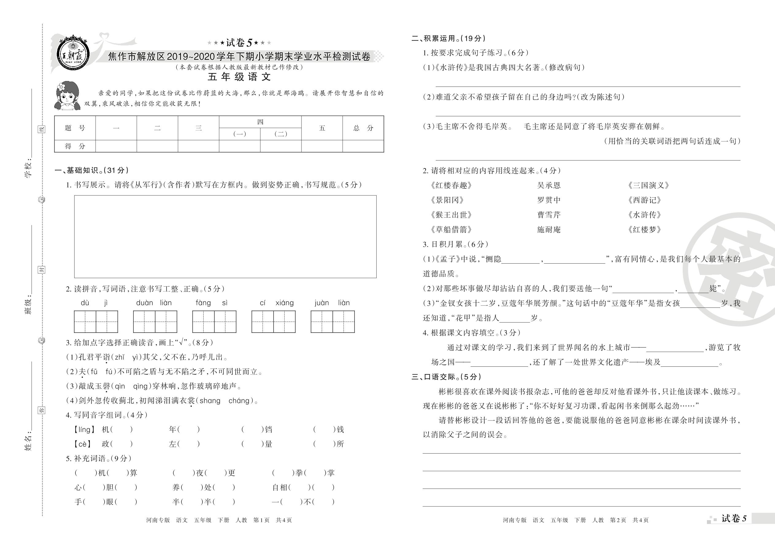 2019-2020学年第二学期焦作市解放区五年级语文试卷(人教版)【5】