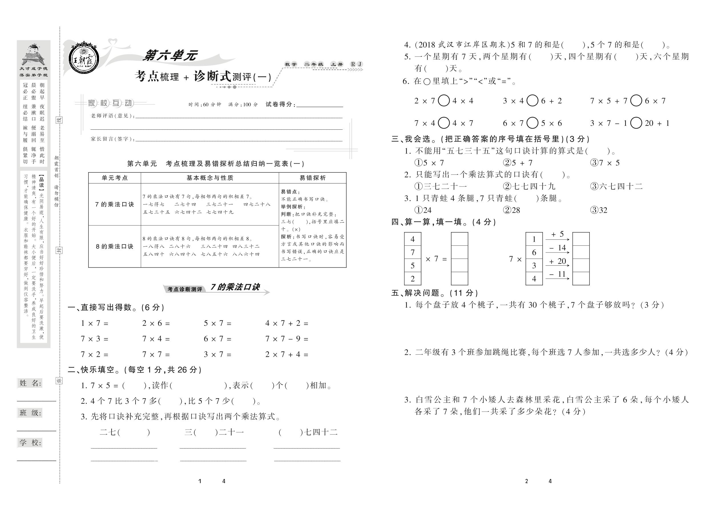 2020上册二年级数学人教版 第六单元 考点梳理+诊断式测评(一)