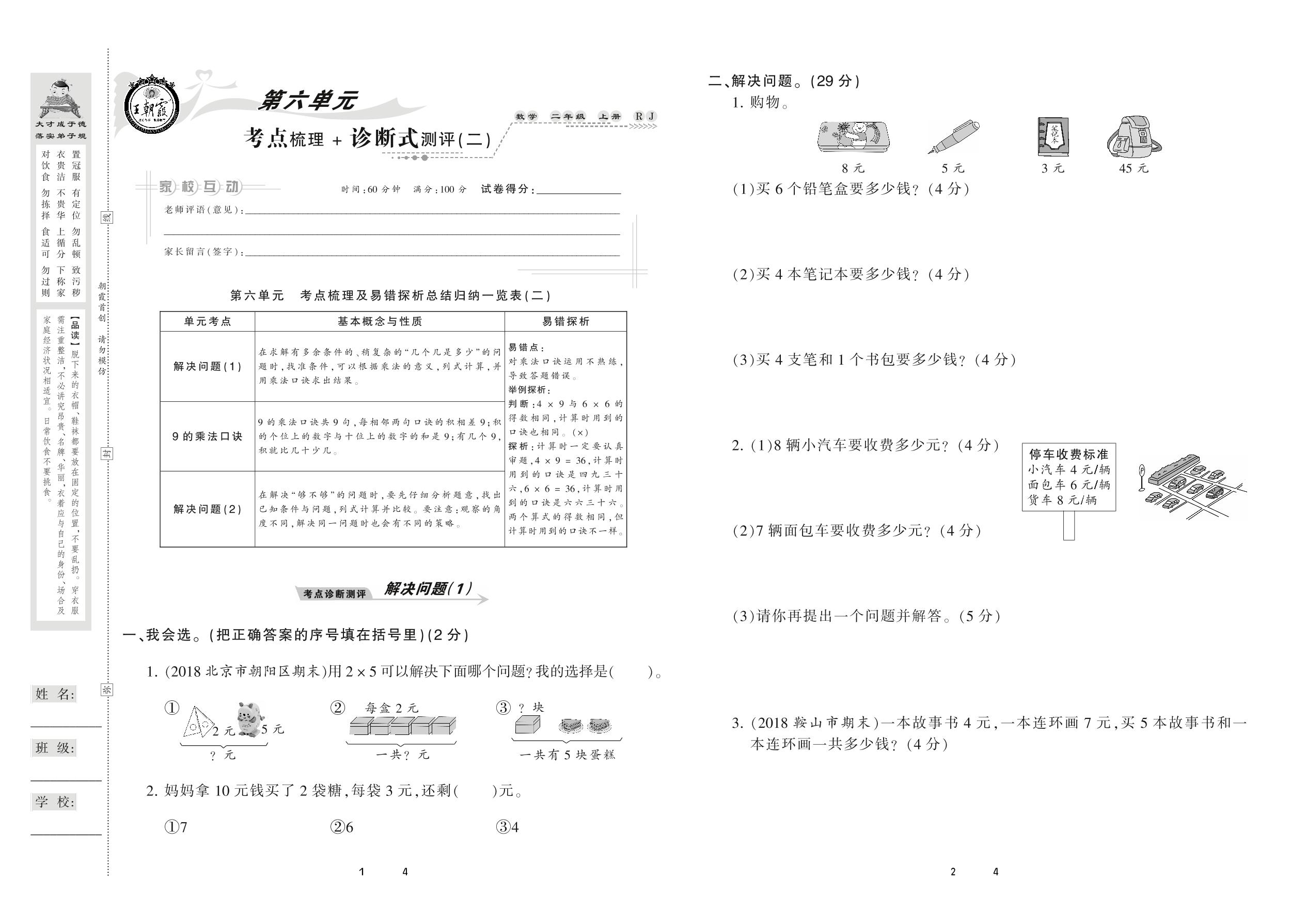 2020上册二年级数学人教版 第六单元 考点梳理+诊断式测评(二)