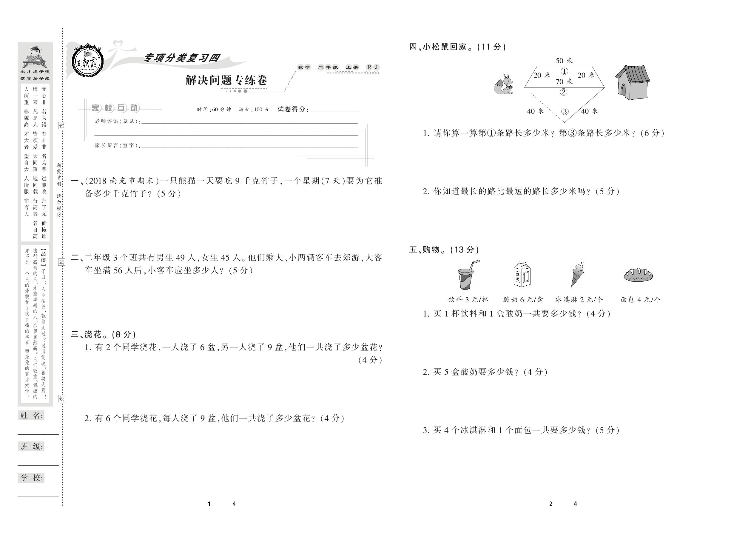 2020上册二年级数学人教版 解决问题专练卷