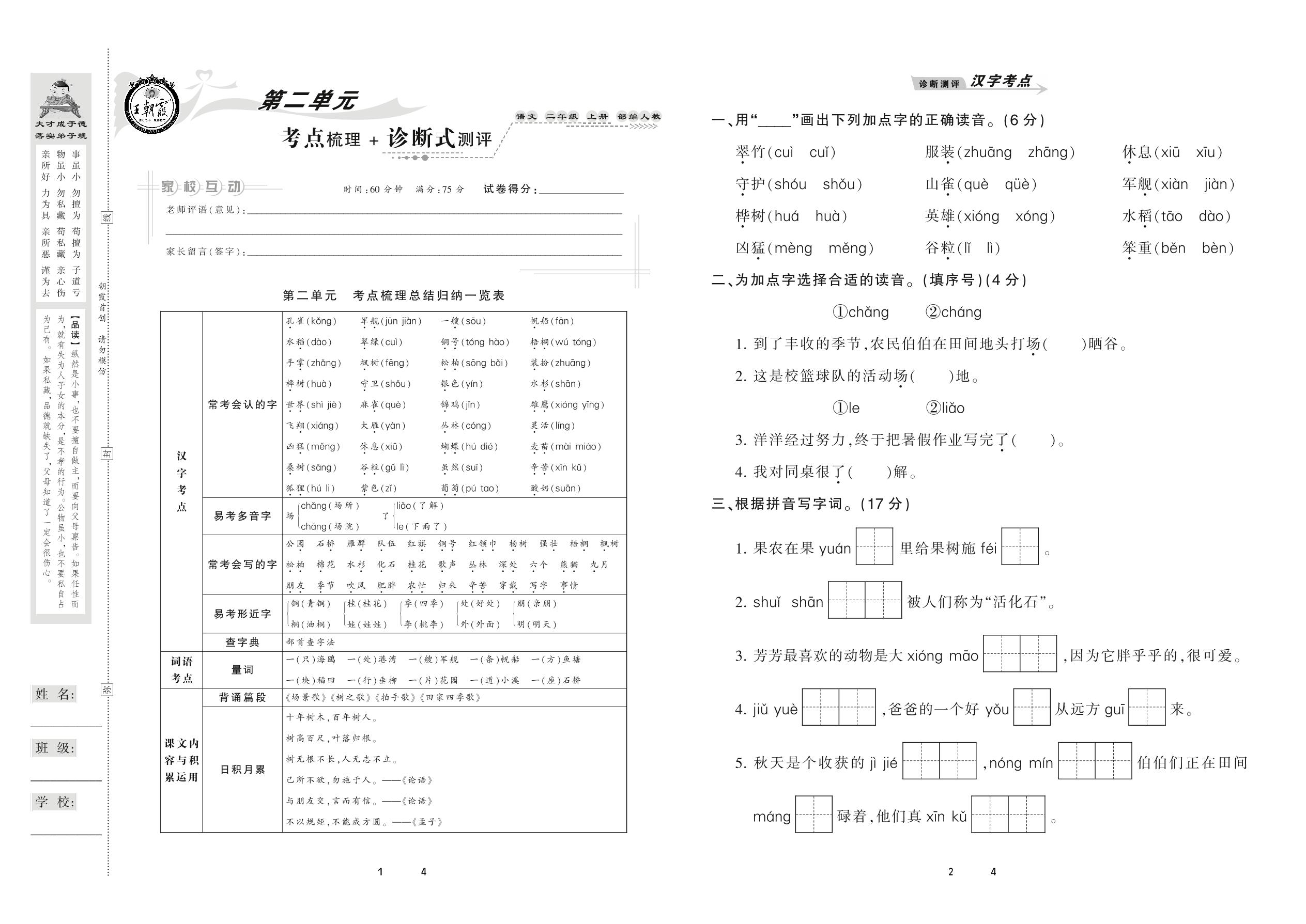2020上册二年级语文人教版 第二单元 考点梳理+诊断式测评