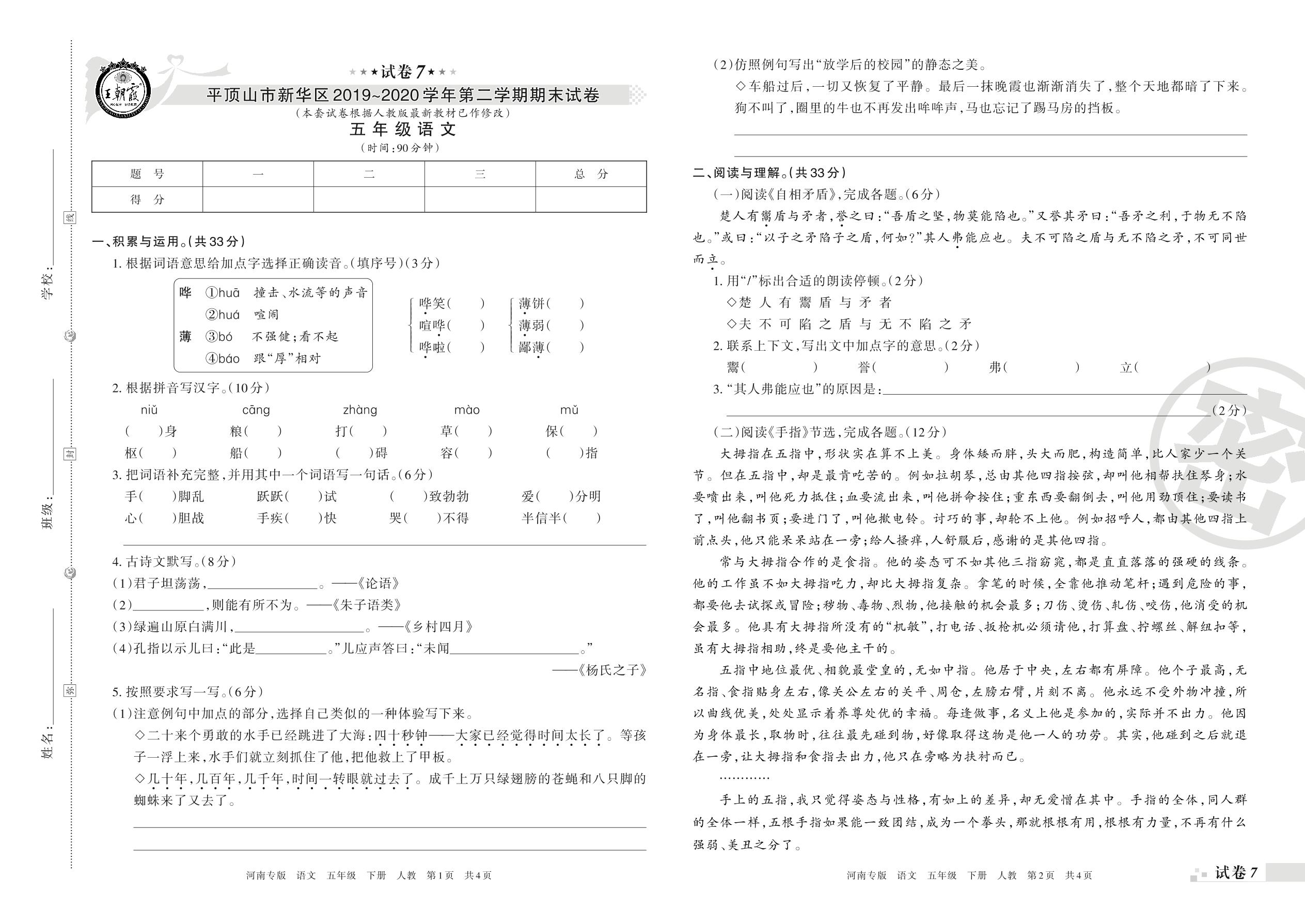 2019-2020学年第二学期平顶山市新华区五年级语文试卷(人教版)【7】