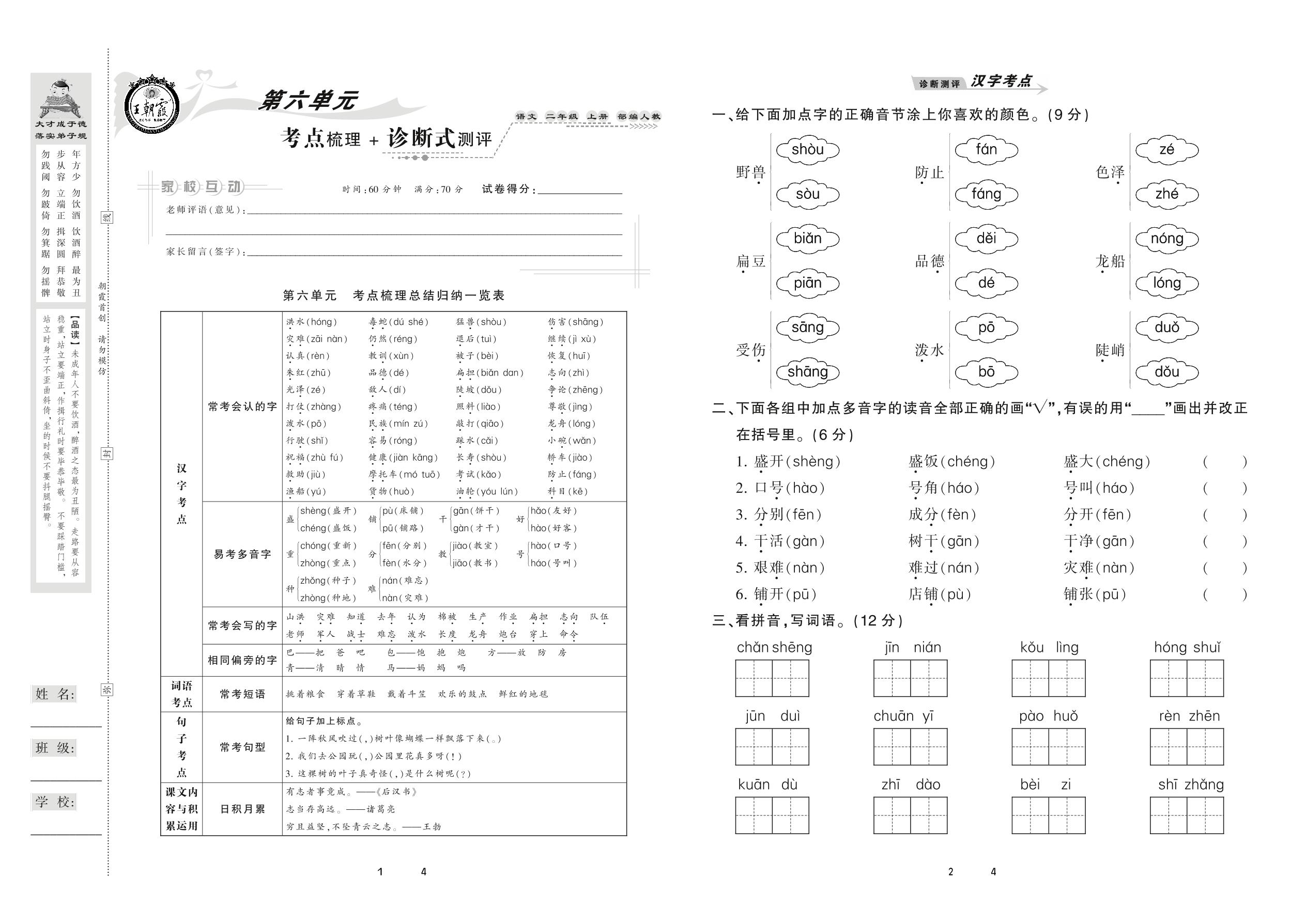 2020上册二年级语文人教版 第六单元 考点梳理+诊断式测评