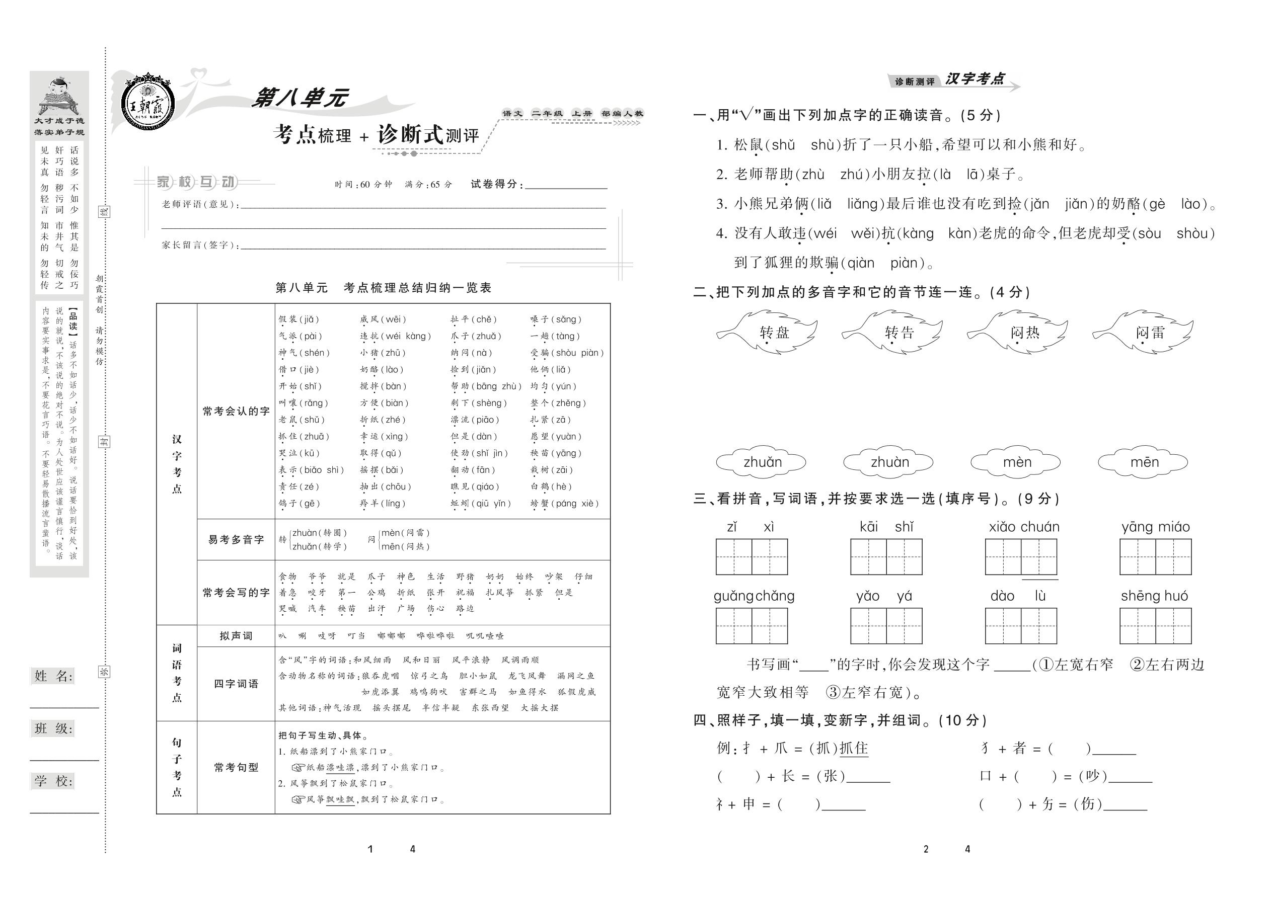 2020上册二年级语文人教版 第八单元 考点梳理+诊断式测评