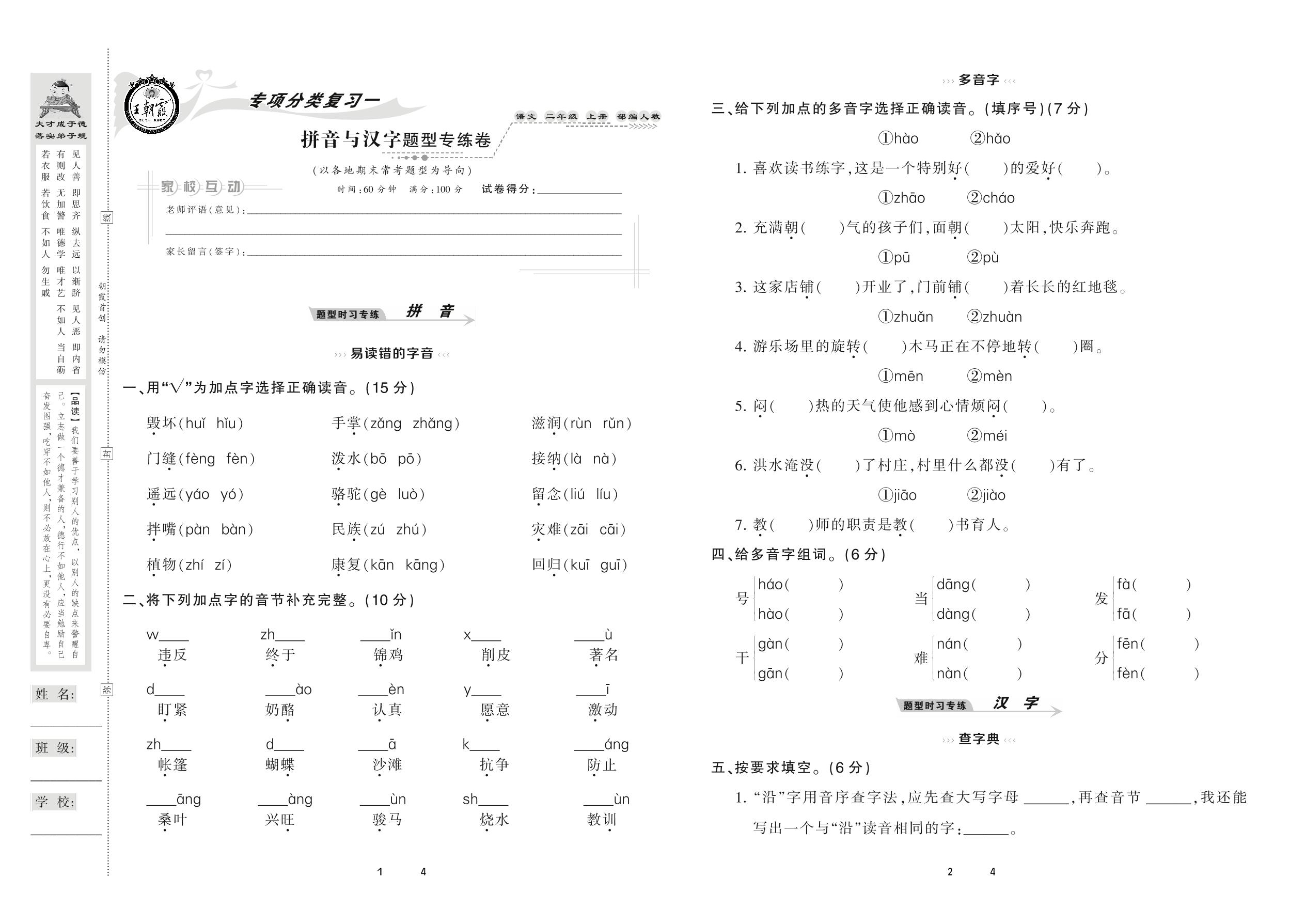 2020上册二年级语文人教版 拼音与汉字题型专练卷