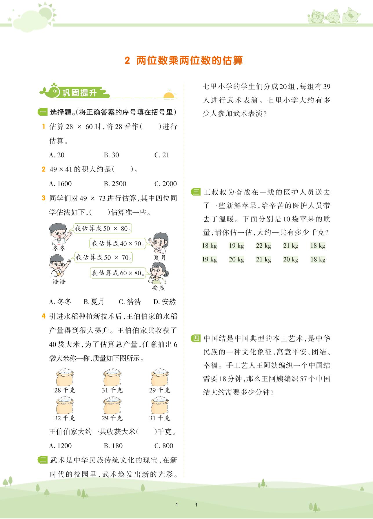 2021下册三年级数学苏教版 第一单元 两位数乘两位数——2 两位数乘两位数的估算