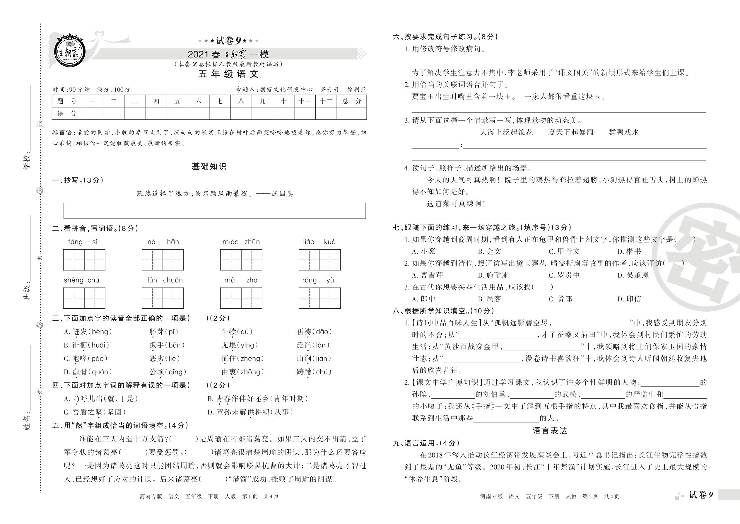王朝霞期末模拟卷五年级下册语文(人教版)_R210801182829【9】