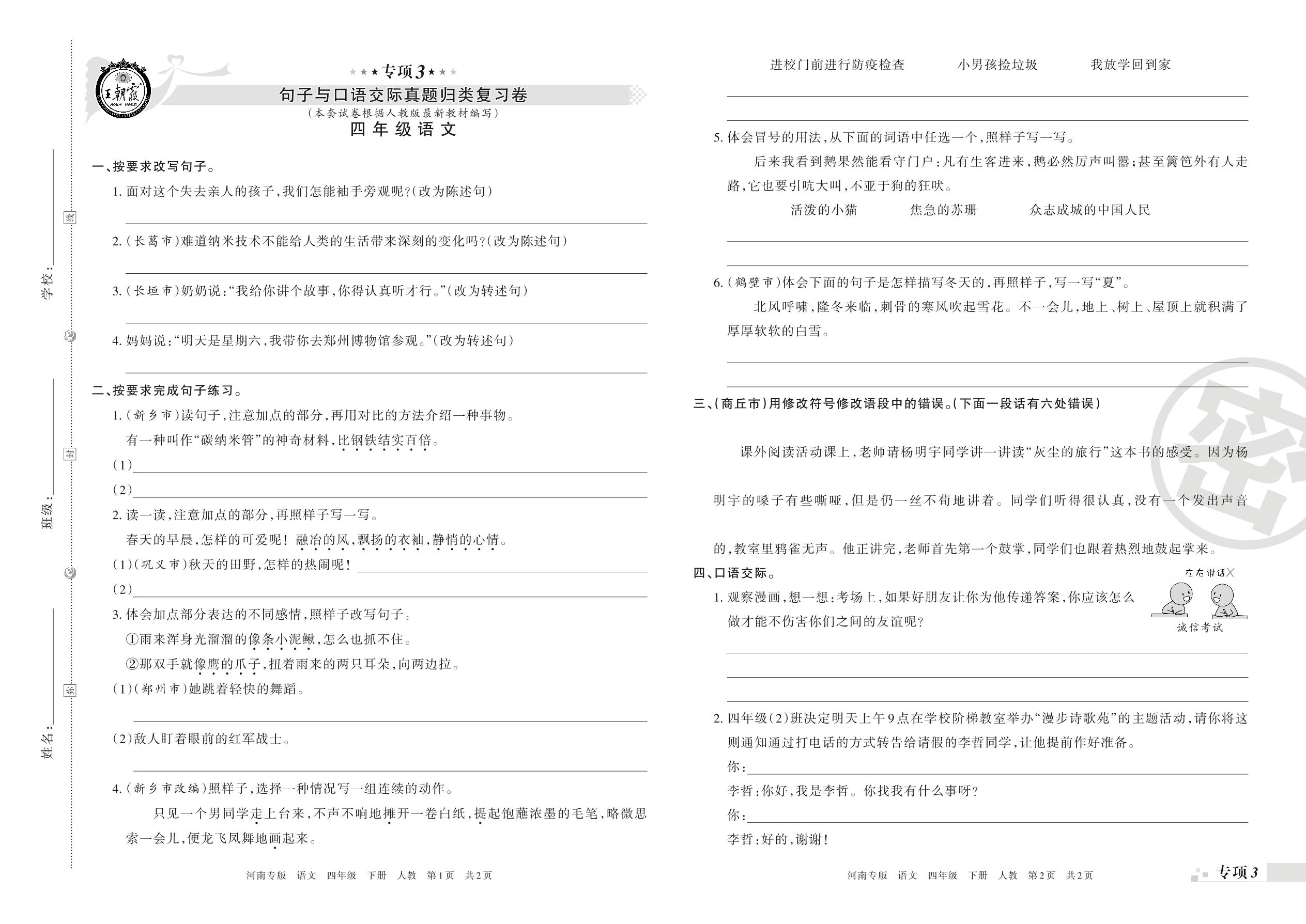 王朝霞期末专项卷——句子与口语交际、课文内容与积累运用真题归类复习四年级下册语文(人教版)【0】