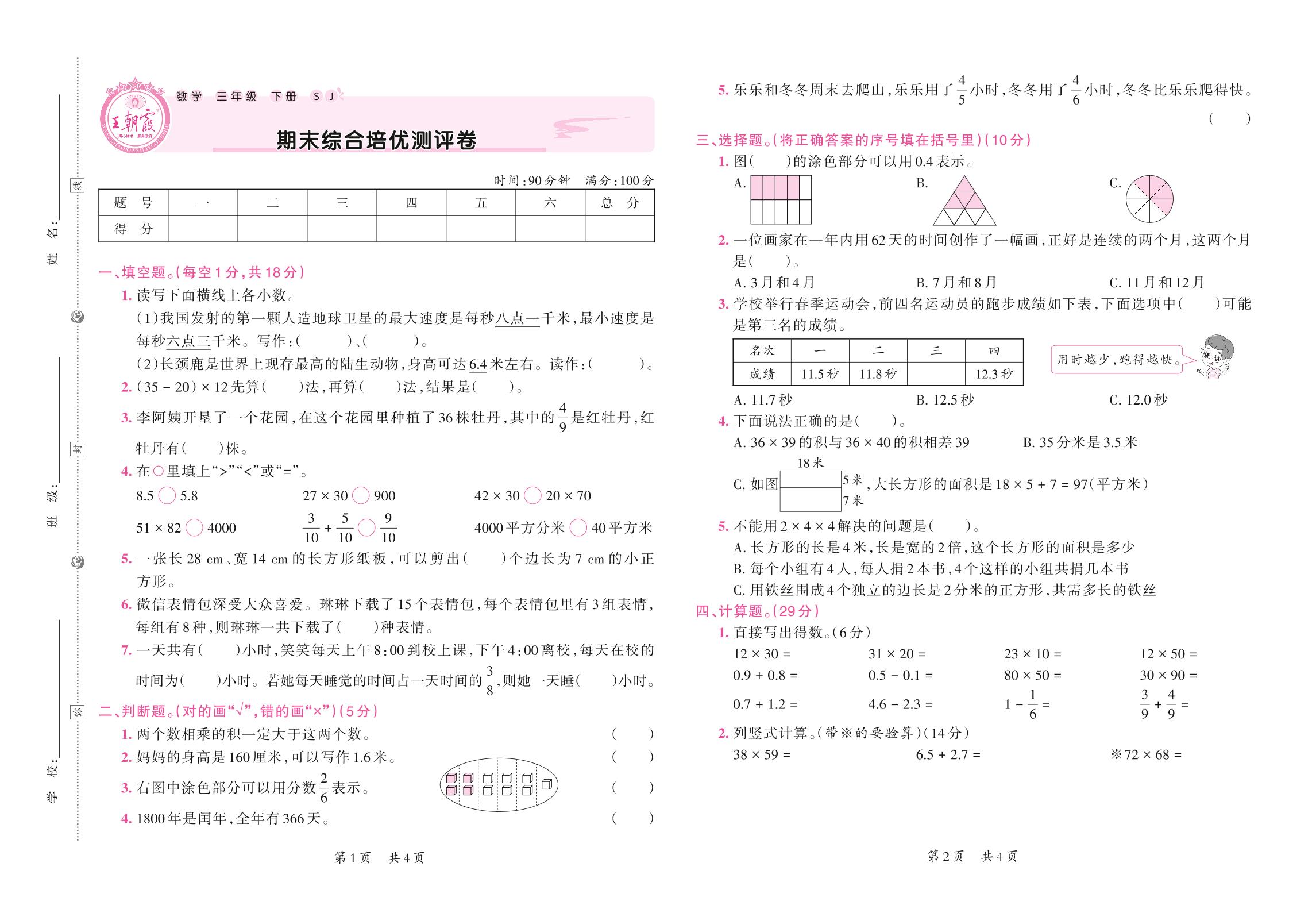 2021下册三年级数学苏教版 期末综合培优测评卷