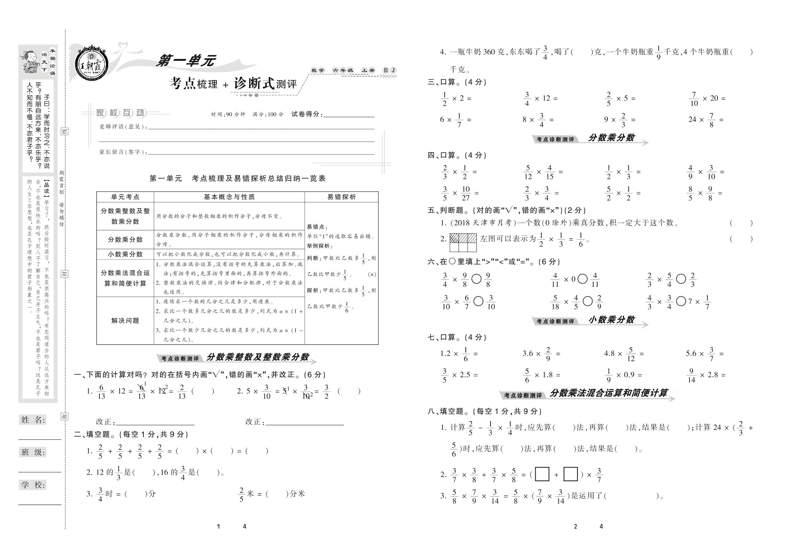 2020上册六年级数学人教版 第一单元 考点梳理+诊断式测评