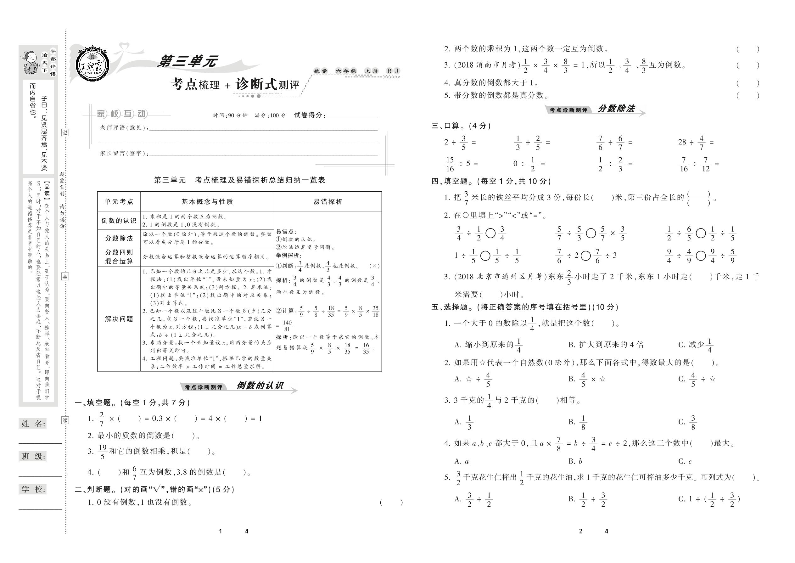 2020上册六年级数学人教版 第三单元 考点梳理+诊断式测评