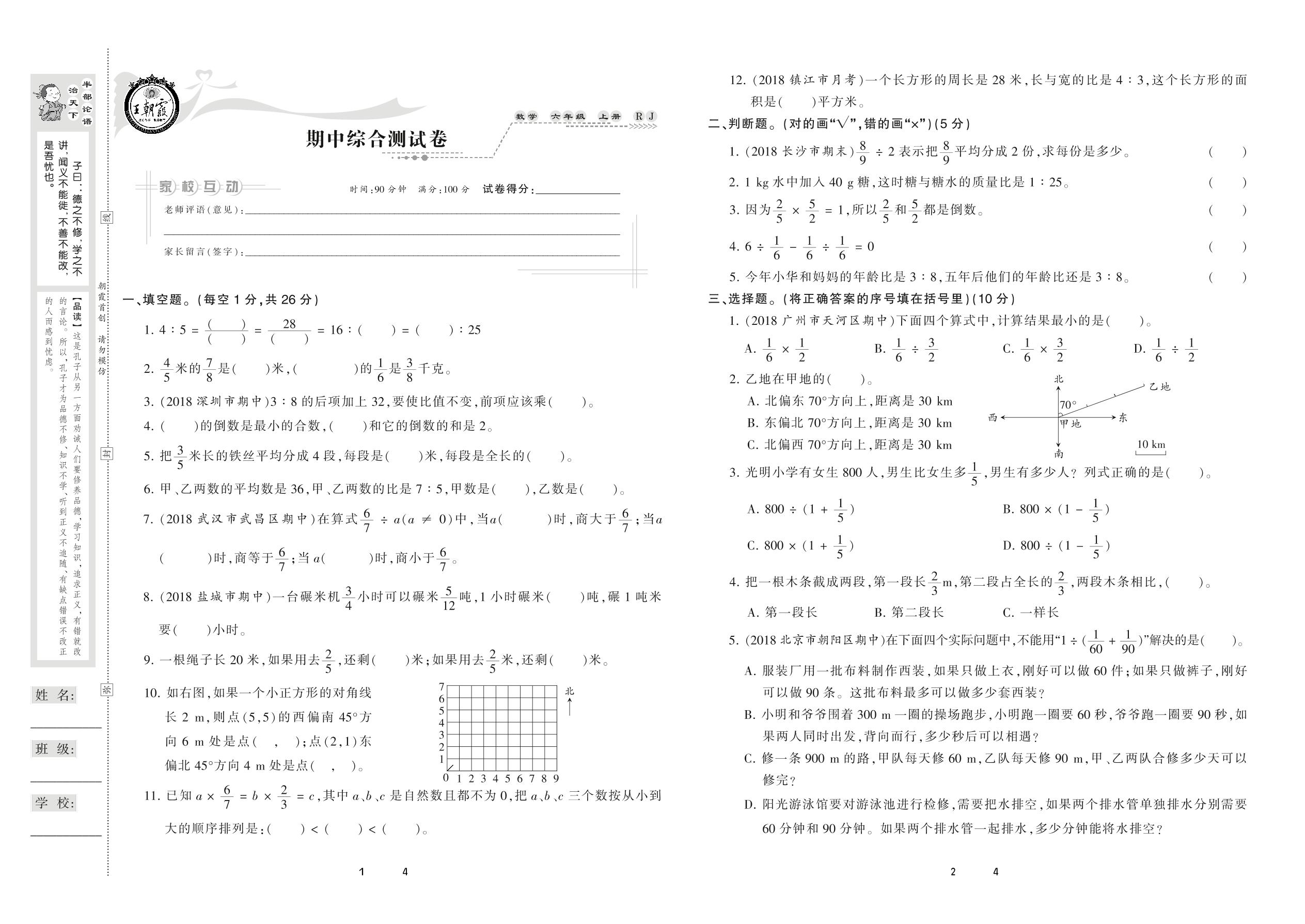 2020上册六年级数学人教版 期中综合测试卷