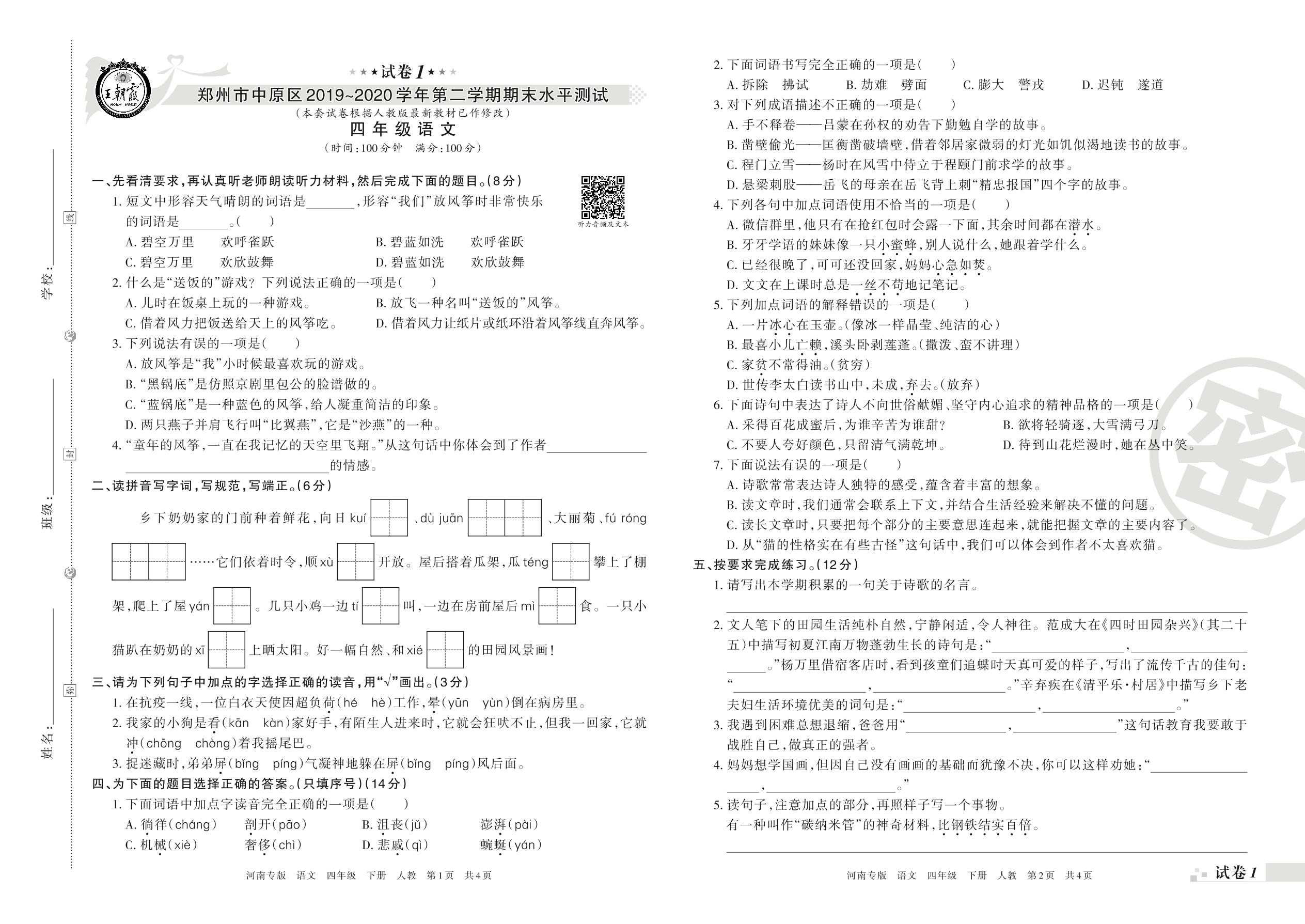2019-2020学年第二学期郑州市中原区四年级语文试卷(人教版)_R210801182903【1】