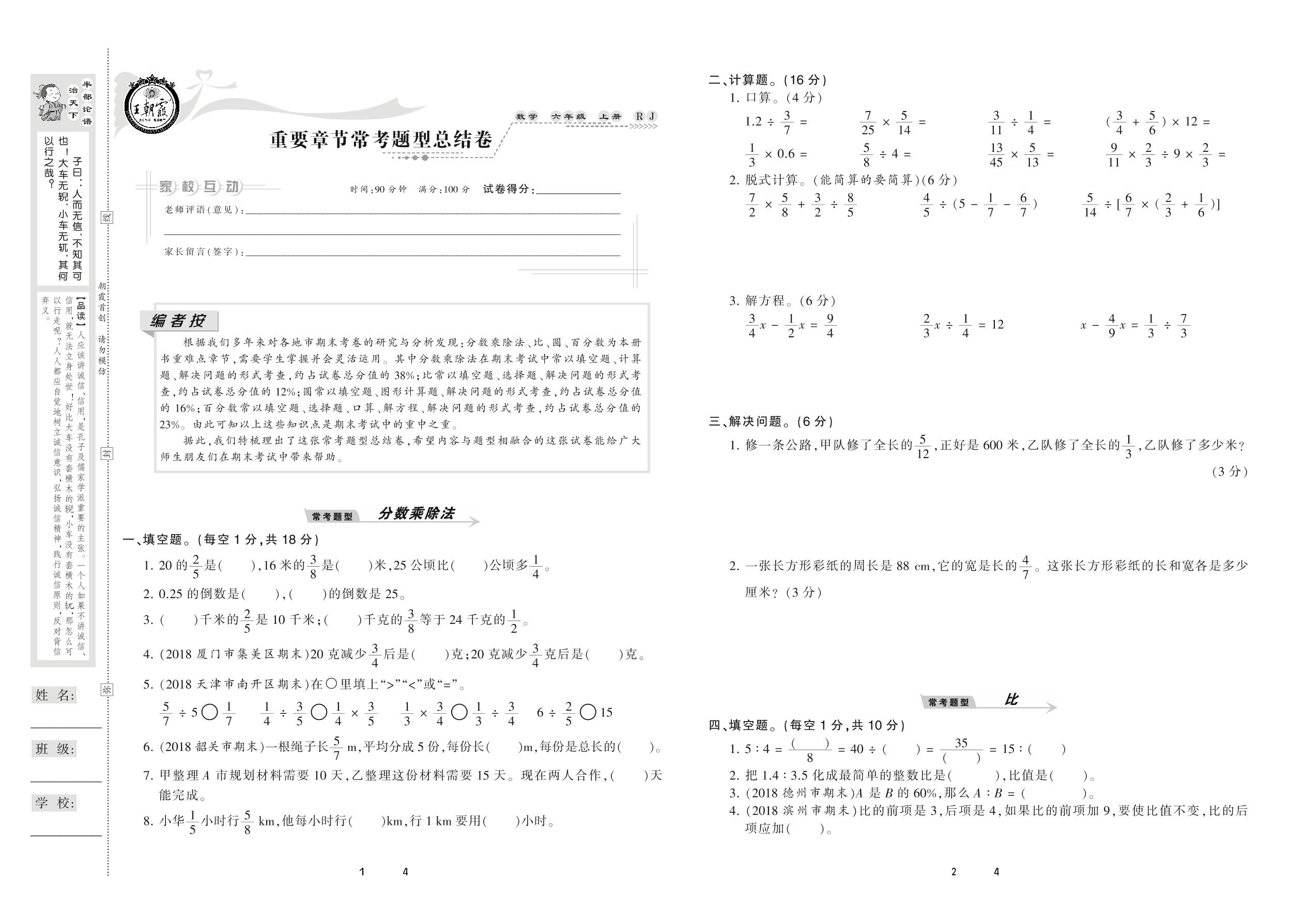 2020上册六年级数学人教版 重要章节常考题型总结卷