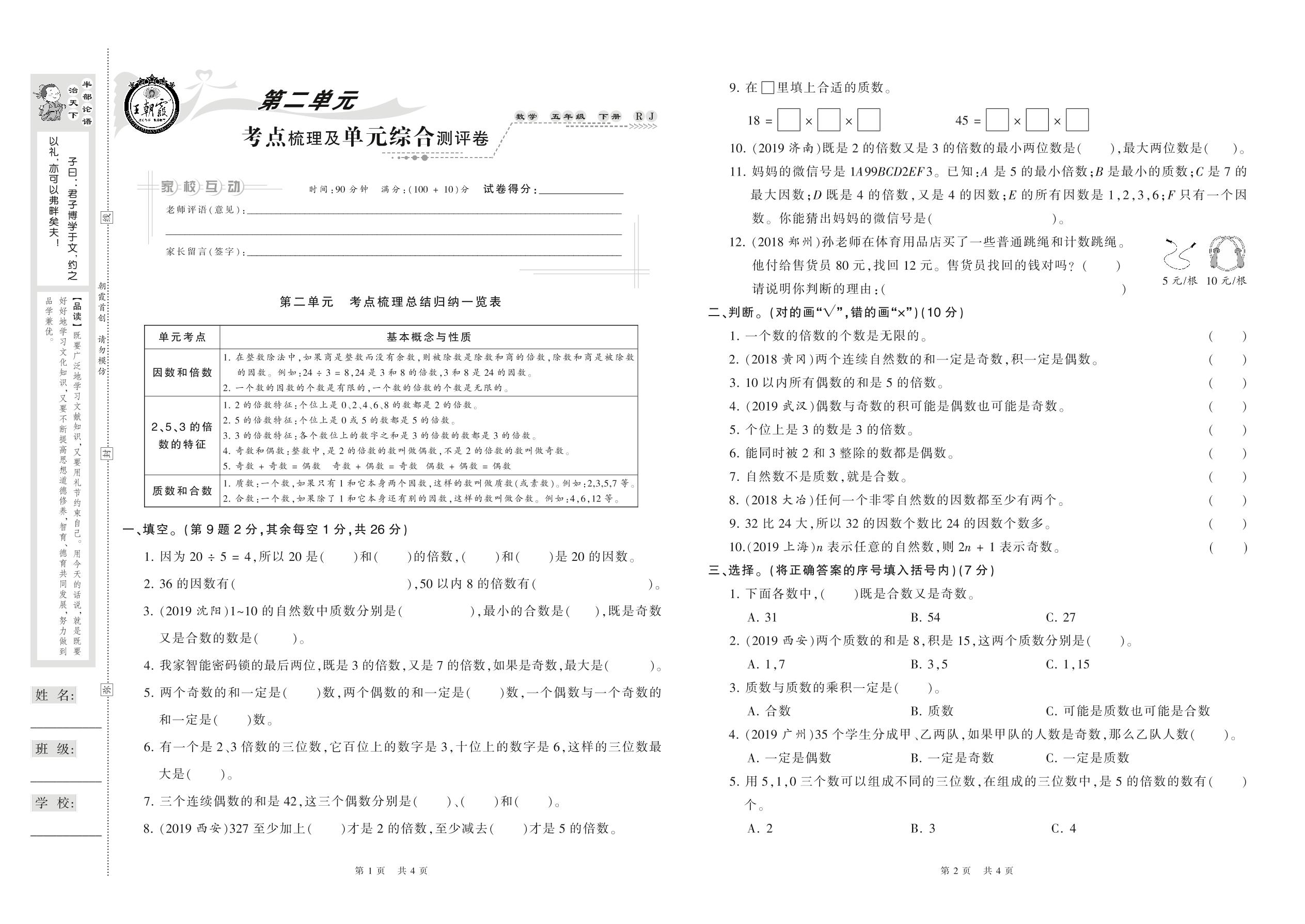 2021下册五年级数学人教版 第二单元 考点梳理及单元综合测评卷