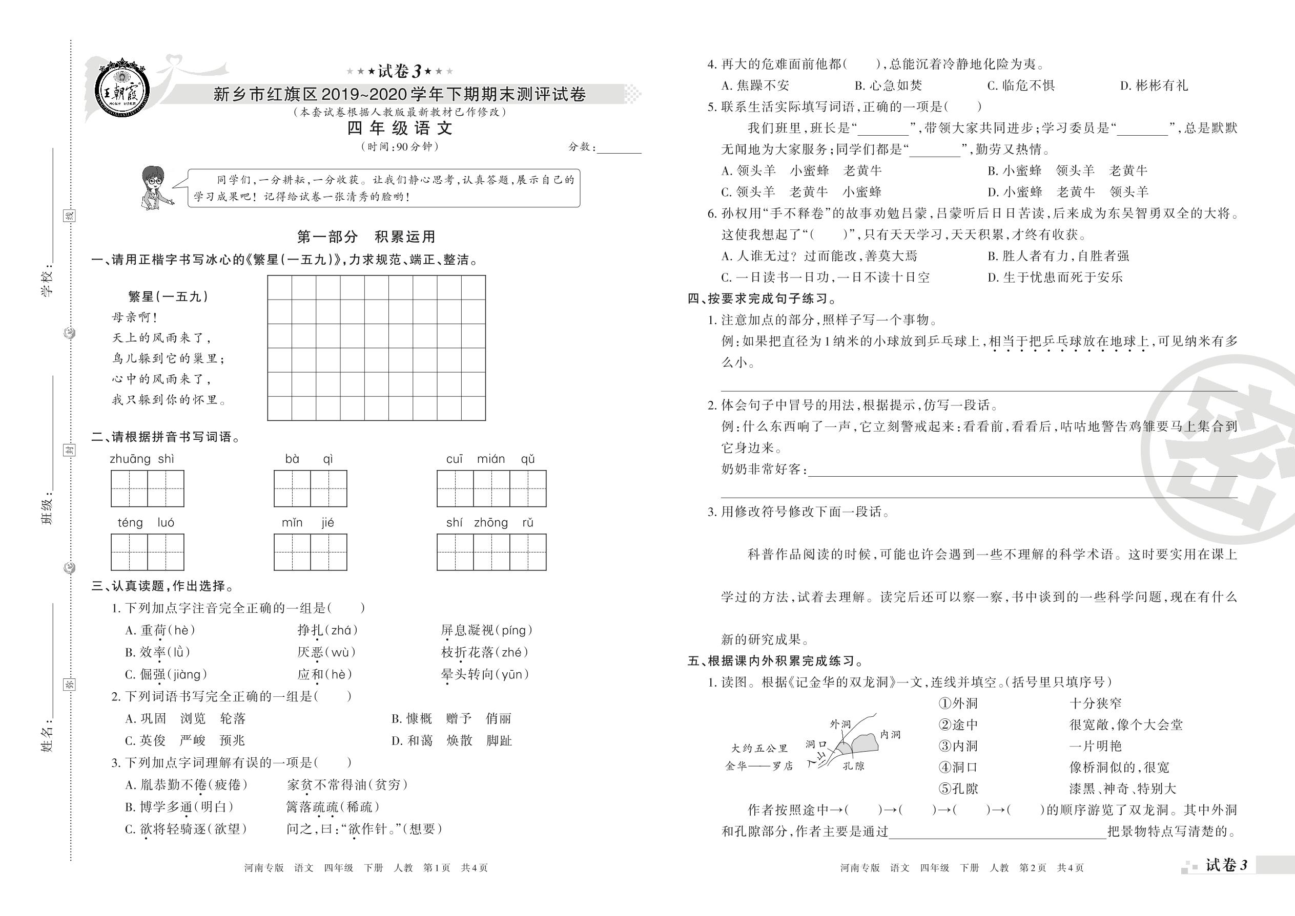 2019-2020学年第二学期新乡市四年级语文试卷(人教版)【3】
