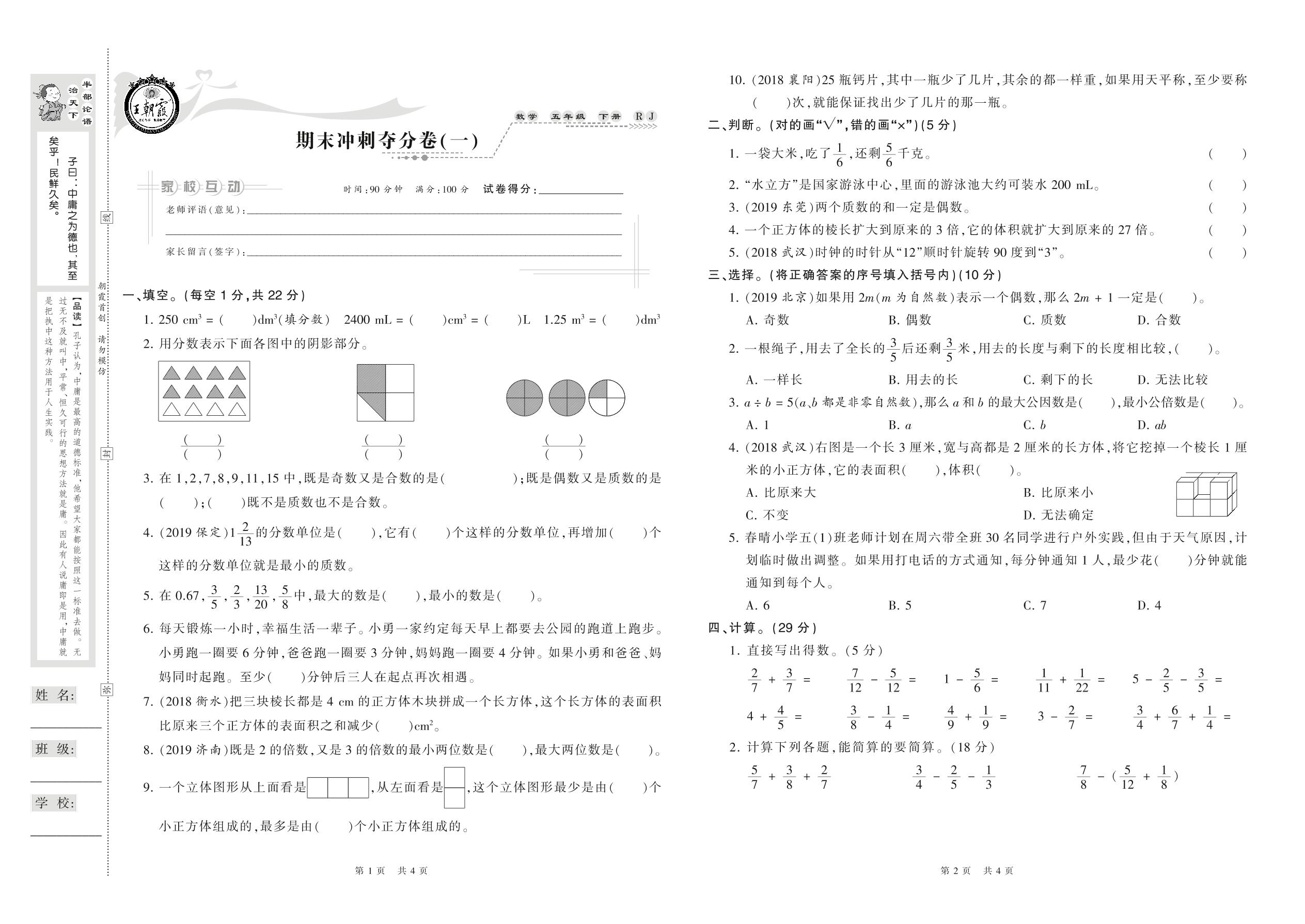 2021下册五年级数学人教版 期末冲刺夺分卷(一)
